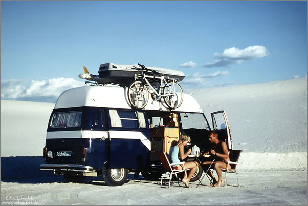 Nur ein halbes Jahr später kauften wir uns dann das erste Mal ein richtiges Fahrzeug. VW Bus Typ II, 70 PS, Baujahr 1978. Mit 70 Ps war der Bulli im Vergleich zu seinen Vorängern schon eine richtige Rakete. In wochenlanger Arbeit enstand unser erstes Reisemobil. Kühlschrank, Heizung, Spüle mit fließend Wasser und einem gemütlichen Bett. Während des gesamten Studiums begleitete uns unser Bulli als treuer Gefährte. In den Sommermonaten fuhren wir mit unserem Schiff (420er) nahezu jedes Wochenede auf irgendwelche Regatten. Im Frühjahr ging es immer zunächst einmal zu einer Regatta nach Mallorca, dann kam Marseile und weiter ging es im Sommer mit vielen kleinerern Regatten bis hin zu der Kieler Woche, der Travemündener Woche und den Deutschen Meisterschaften. Im Winter ging es zum Skifahren in die Alpen und im Sommer 1986 rund um die Iberische Halbinsel, über Tarifa (Surfen :-)) nach Portugal und wieder zurück nach Hamburg. Im Sommer 1987 führte uns unsere Reiselust durch die ganze Türkei bis nach Kapadokien.