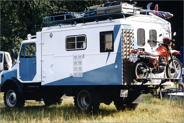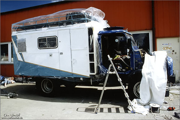 In jahrelanger Arbeit machten wir uns dann an den Ausbau. Es war unser größtes Projekt, dass wir je bewältigt haben. Der Hanomag kam direkt vom technischen Hilfswerk und hatte überhaupt nichts mit einem Wohnmobil zu tun. Zunächst einmal wurde alles aus dem Aufbau raus geschmissen und dann begann der Ausbau. Dieses sollte unser Meisterstück werden. Kühlschrank, Dusche mit fließend warmen Wasser, Spüle, Kocher Hängeschränke, Tresor, Durchgang zum Führerhaus, seitliche Eingangstür, Dachgepäckträger, 2 Diesel Zusatztanks, Motorradhalterung samt Kram und vieles mehr.