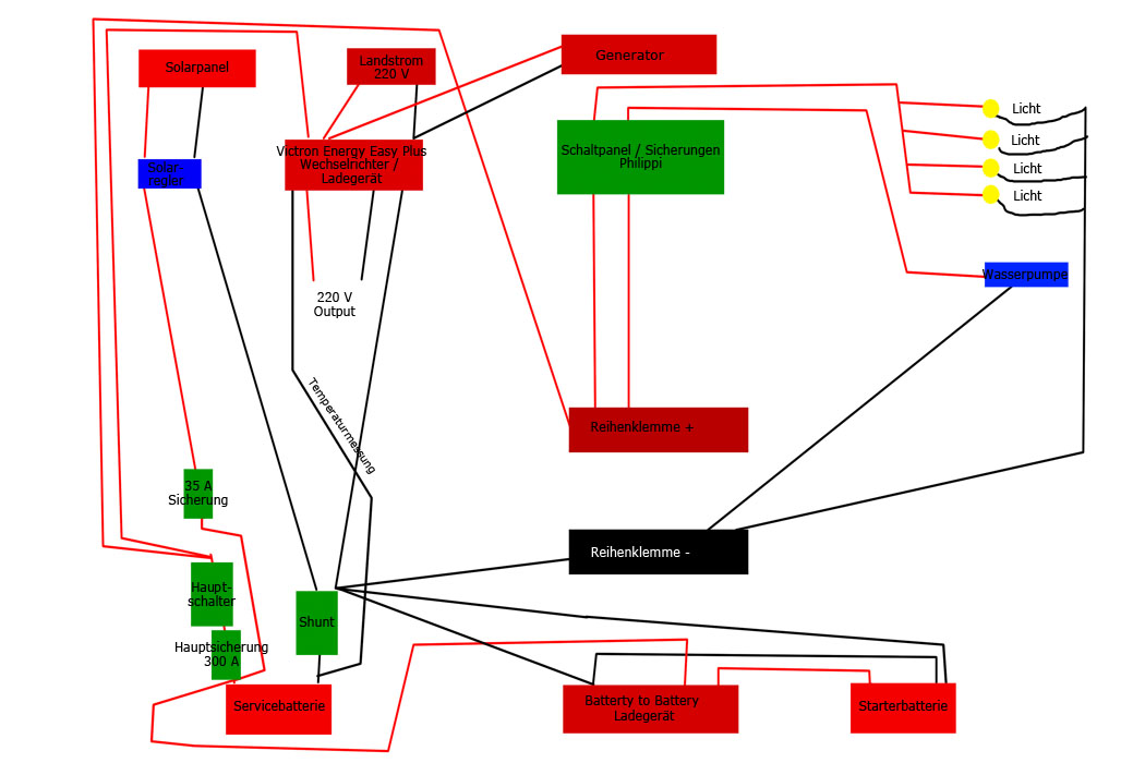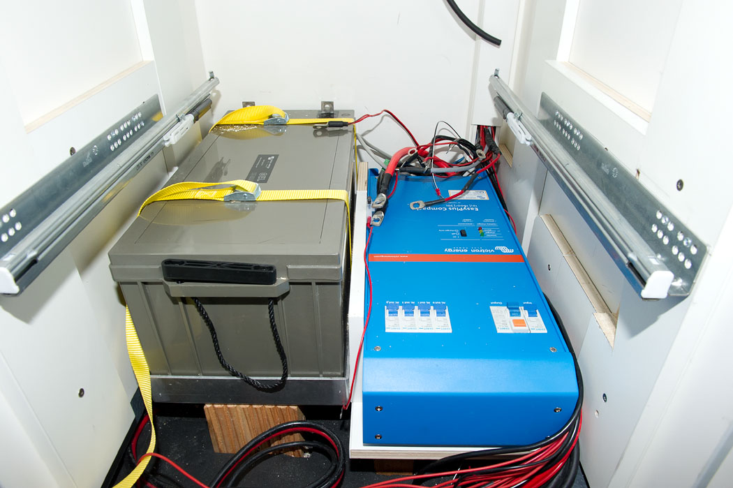Nun stellt sich vermutlich der ein oder andere die Frage, warum nur eine Batterie? Beim Ausbau eines Expeditionsmobil spielt immer wieder das Gewicht eine Rolle. 70kg für 220Ah ist schon so einiges. Hinzu kommt, dass die Batterien nicht gerade billig sind und eine begrenzte Lebensdauer haben. Ein Generator wiegt 13 kg, hat eine deutlich längere Lebenszeit, kann bei Bedarf zu Hause gelassen werden und kann auch für andere Verwendungszwecke benutzt werden. Einbauort: Wenn wir schon beim Thema Gewicht sind, spielt auch der Einbauort der Batterie (70kg) und des Wechselrichters incl. Batterieladegerät (11,7kg) eine Rolle. Um das Gewicht möglichst weit nach vorne zu bringen, habe ich beides unter den Kühlschank gebaut. Über dem Wechselrichter befindet sich das Sterling B2B Ladegerät, der Hauptschalter für die Versorgungsbatterie und die Sicherungen. Der Platz reicht völlig aus und die gesamte Elektrik liegt so dicht beieinander. Zur Verteilung habe ich zwei Reihenklemmen gewählt, die auf einer Erhöhung direkt im Eingangsbereich unter dem Fußboden ist. Der Fußboden ist über ein Scharnier leicht zu öffnen. Die Fotos zeigen das Ganze hoffentlich ein bisschen besser. Steuerungstechnik: Zur Steuerung der gesamten Technik habe ich von Philippi das Kontrollpanel STV 228 gewählt. 8 abgesicherte einzelne Stromkreise, Batterieanzeige, Wassertankanzeige, zwei freie Schalter (einen habe ich gewählt um ein bistabiles Trennrelais anzusteuern, dass als Hauptschalter funktioniert und eine 12 V Steckdose reichen für meine Bordelektrik meines Erachtens aus. Zusätzlich kann ich über ein Controlpanel den Easy Plus ansteuern und auch die Ladekapazität / Eingangsspannung regulieren, d.h. wenn auf einem Campingplatz nur 4 A aus dem Stromanschluss kommen, kann ich das Ladegerät so runter regeln, dass nicht gleich die Sicherung bei dem Campingplatzanschluss rausfliegt. Außerdem habe ich eine Gasfüllstandsanzeige, die mir sagt, wie viel Gas im Gastank ist. Den Schaltplan mit weiteren Angaben gibt es bei den Fotos.