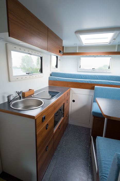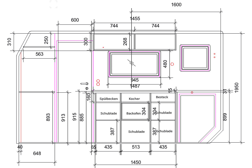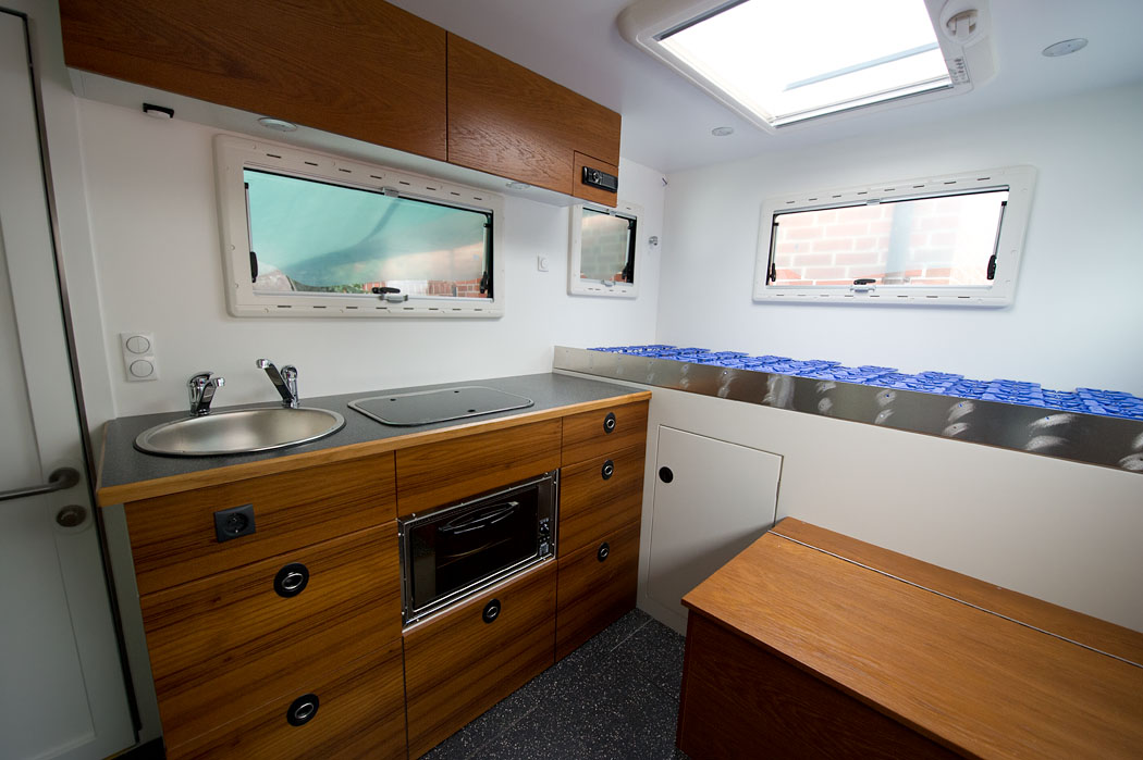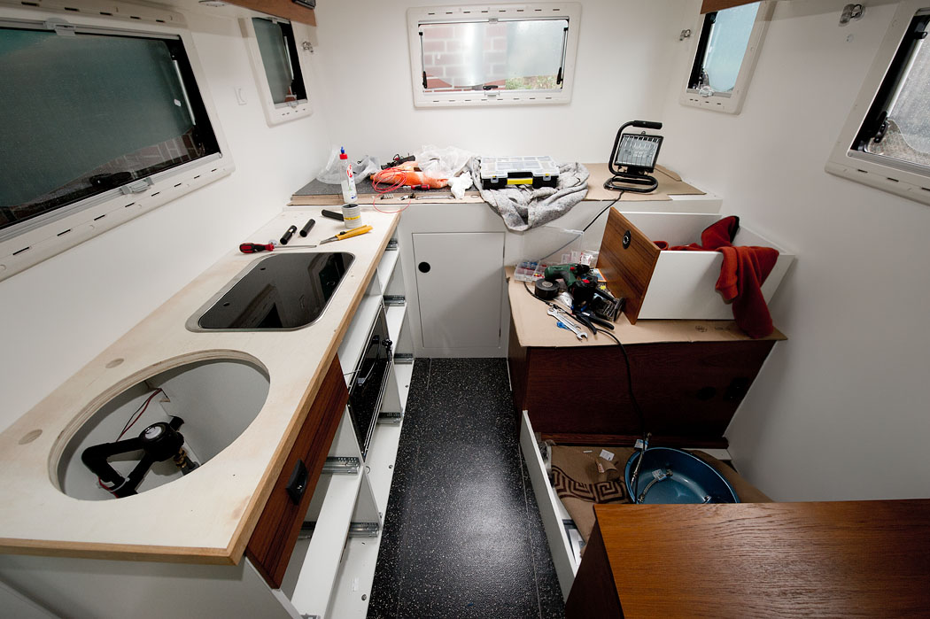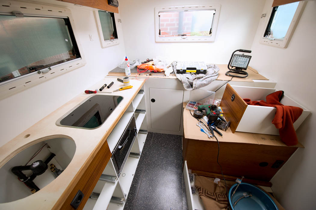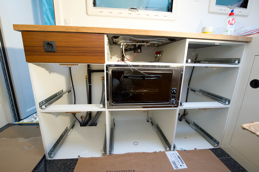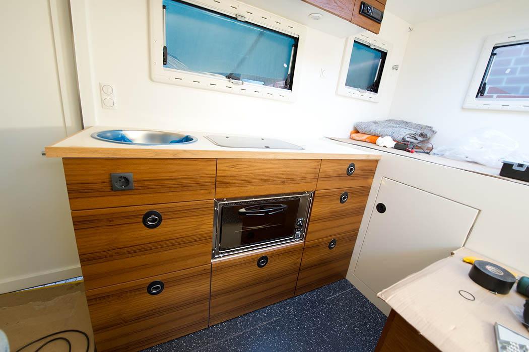Küchenblock: Nach Gesprächen mit Doro wurde mir schnell klar, dass ich den Schrank außerhalb des Autos bauen muss. So hatte ich die genauen Maße für die Platten berechnet und zuschneiden lassen. Den Schrank habe ich dann mit Doro gemeinsam gebaut. Während sie sich mit den 6 Schubladen beschäftigt hat, habe ich den Korpus gebaut. Besonders die Einpassung des Backofens gestaltete sich als nervig, da die tatsächlichen Außenmaße nicht den angegebenen entsprachen. Große Irrwege haben wir bei der Wahl der Küchenarbeitsfläche beschritten. Das zunächst ausgesuchte HPL sah so in Natura hässlich aus, dass wir uns nach langem hin und her für ein anderes (HPL Getalit FM 137) entschieden haben, dass uns sehr gut gefällt. Die Arbeitsplatte hat eine Stärke von 30mm und rund herum eine Teakleiste. Auch der Tisch ist mit dem gleichen Material belegt worden.