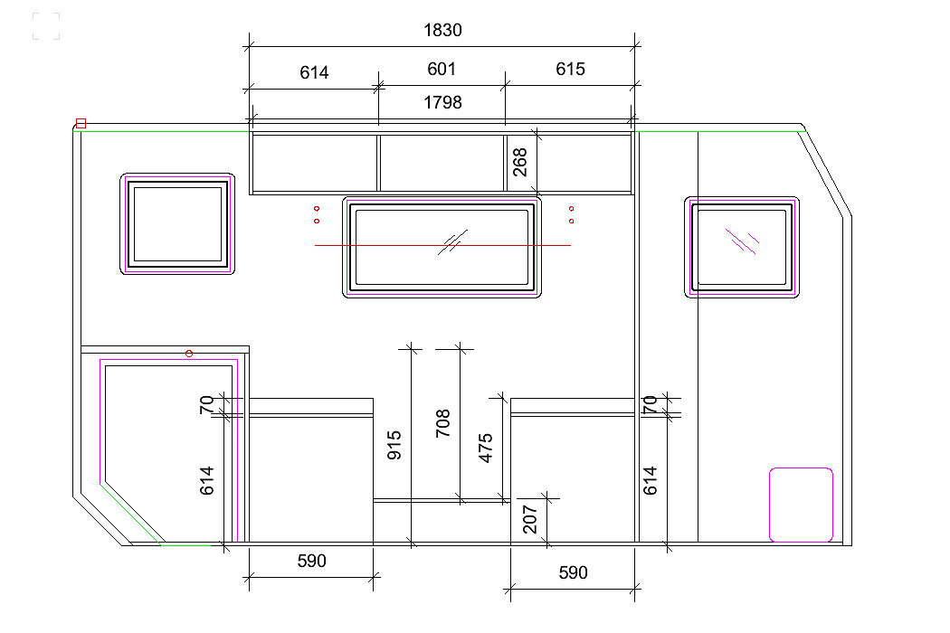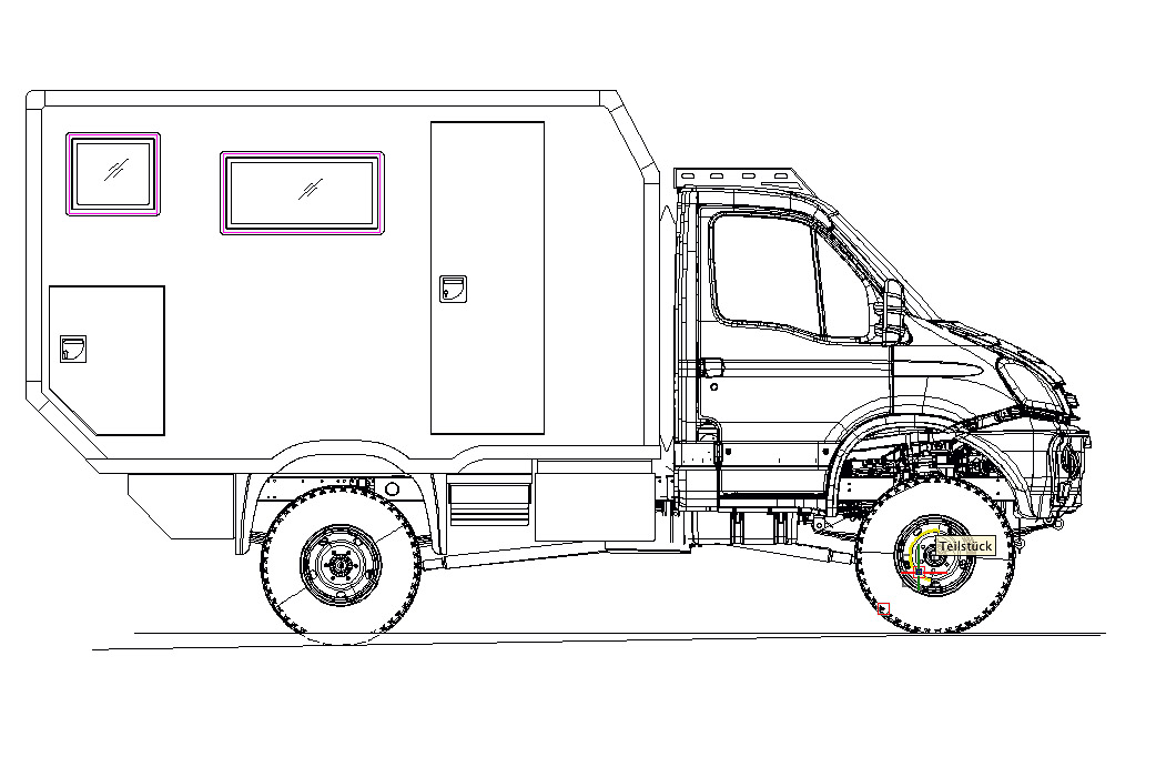 Innenaufteilung:Von der Innenaufteilung haben wir nach langem Hin und Her das Badezimmer vorne quer im Fahrzeug platziert. So muss man zwar durch die Dusche ins Führerhaus steigen, aber der Platz ist auf diese Weise am besten genutzt. Das Bett wird hinten quer auf das Staufach gebaut und hat eine Länge von 2,04m und eine Breite im ausgezogenen Zustand von 1,50m. Um es kurz zu machen – die genauen Abmessungen sind den Explosionszeichnungen zu entnehmen, die ich einem CAD Programm erstellt habe. Im Großen und Ganzen entspricht unsere Aufteilung dem Konzept der Firma Exploryx, das sich nach vielen Überlegungen immer wieder als gut erwiesen hat.