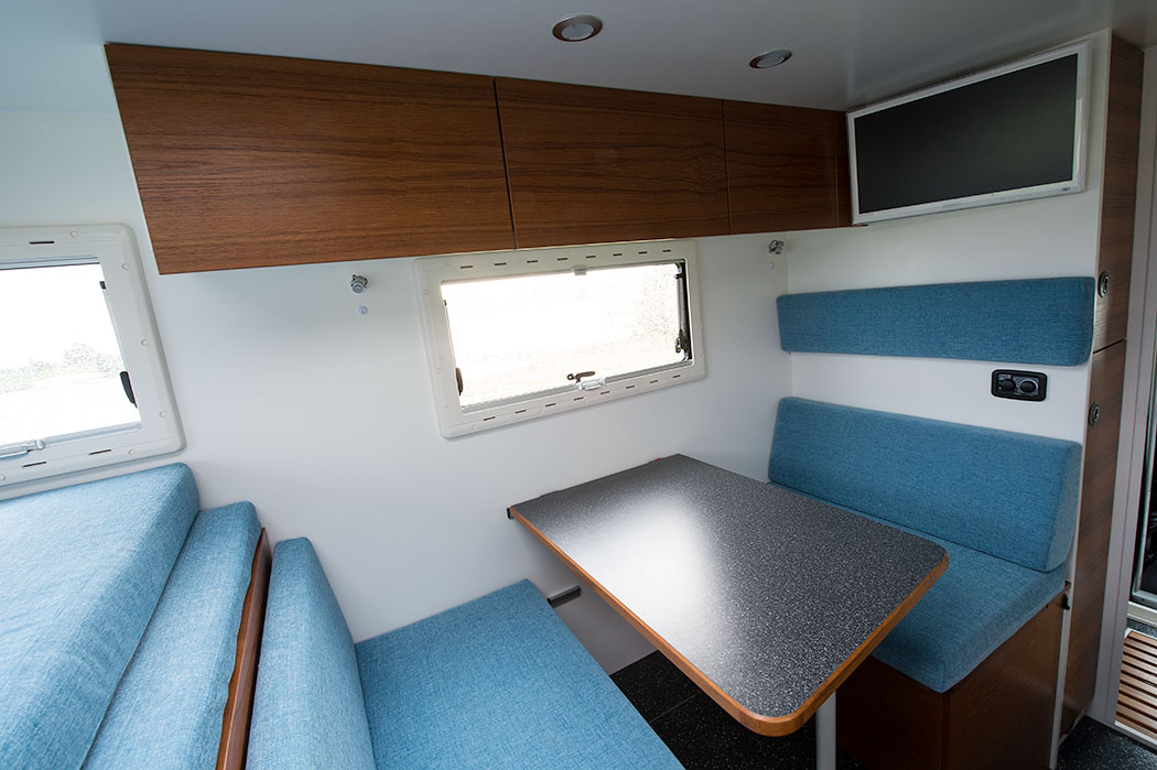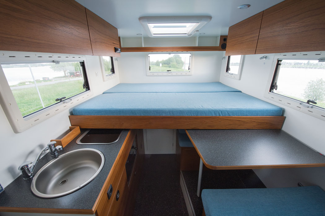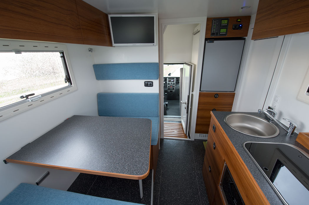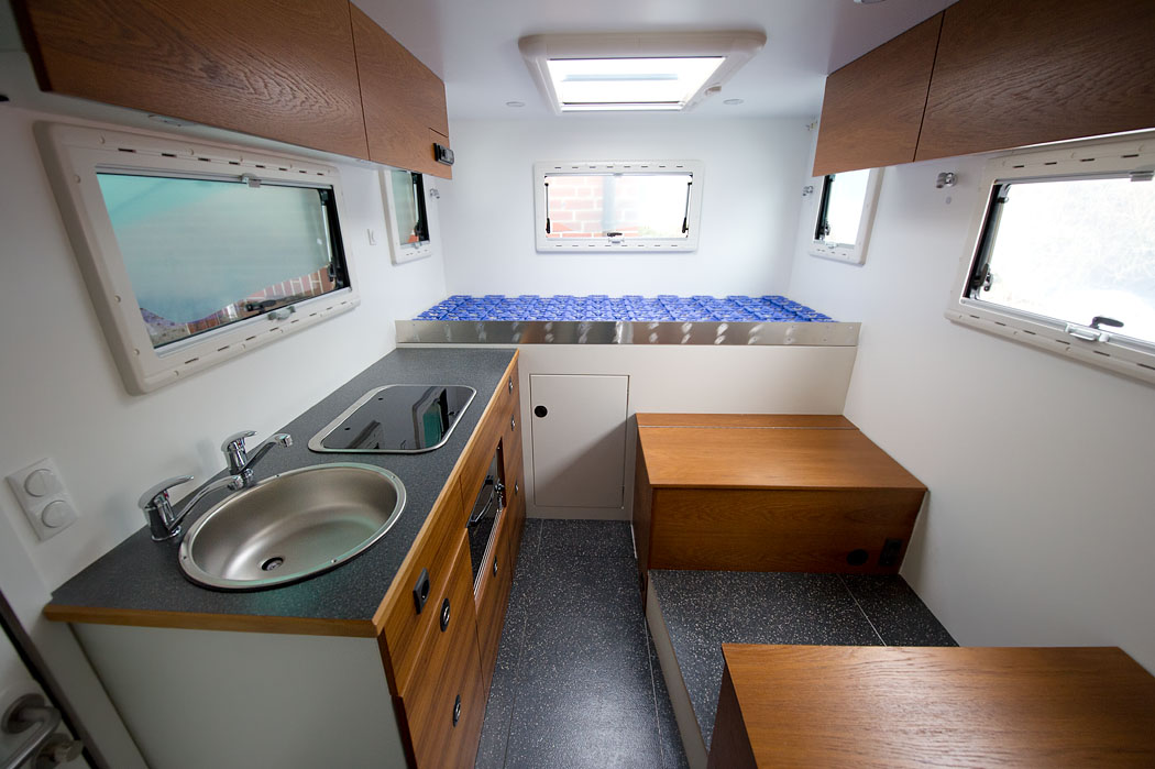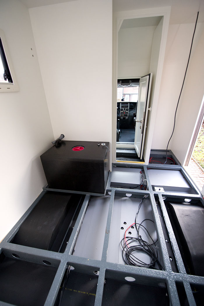 Sitzbänke: Die Sitzbänke wurden komplett aus Teak gebaut. In der vorderen Sitzbank befindet sich der 185 Liter Wassertank, in der hinteren Sitzbank das Wasserfiltersystem und ganz viel Stauraum, wo wir u.a. das Bettzeug verstauen werden, da wir nicht ständig im Schlafzimmer wohnen wollen ;-). Zwischen den Bänken befindet sich ein Podest, der als Staufach für die Fotoausrüstung genutzt werden kann. Außerdem hat ein Tresor, der fest mit dem Auto verschraubt ist, darin Platz gefunden. Verriegelt wird das Fach durch einen 12mm Alustab, der durch das Staufach in den Fußboden geschoben wird. Da muss man schon wissen, wie man den Fußboden unter dem Tisch hoch bekommt ;-).