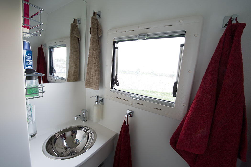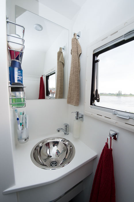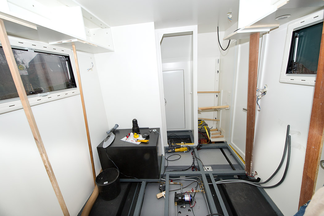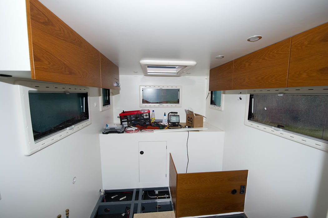 Schrank neben der Tür: In den Schrank neben der Tür wurde im unteren Bereich die gesamte Elektronik (Batterie, Easy Plus (Victron Energy), Batterieladegerät B2B (Sterling), die gesamten Sicherungen und der Hauptschalter eingebaut. Darüber kommt eine große Schublade für die Schuhe und eine Schublade für die ganze Technik incl. drei 220V Steckdosen zum Laden der Akkus und Laptops. Ganz wichtig ist uns ein großer Kühlschrank – wir haben das Modell KB 130 ENI der Firma Kissmann eingebaut, der ein recht großes Gefrierfach hat. Ganz oben ist eine Klappe für die gesamte Steuerungstechnik (Philippi STV 228, Kontrollpanel für das Easy Plus und Füllstandsanzeige des Gastanks). Besonders der Einbau der Schubladen als auch des Kühlschranks gestalteten sich nicht ganz einfach, da die Trennwand der Duschkabine nicht ganz parallel mit der der Außenwand war.