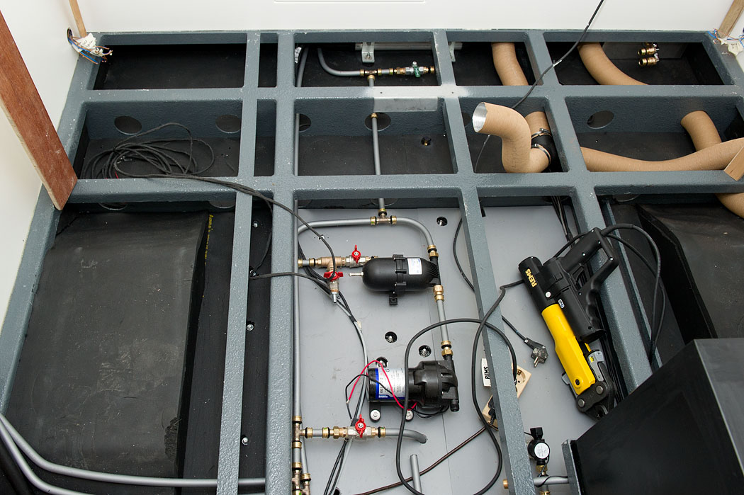 Fußboden: Was aber kommt auf den Fußboden? Der Fußboden soll auch mit Straßenschuhen begehbar sein. Holz kam daher nicht in Frage. Letztendlich haben wir uns für einen Industrieboden der Firma Norament (NORAMENT 926 Grano 4899) entschieden, der laut Herstellerangaben sehr robust sein soll. In den Fußboden habe ich drei Revisionsklappen gebaut, so dass wir problemlos an die Wasserverteilung, den Absperrhahn für den Wasserfilter und die Reihenklemmen der Elektroinstallation kommen. Auch der Stauraum wurde mit dem gleichen Material belegt.