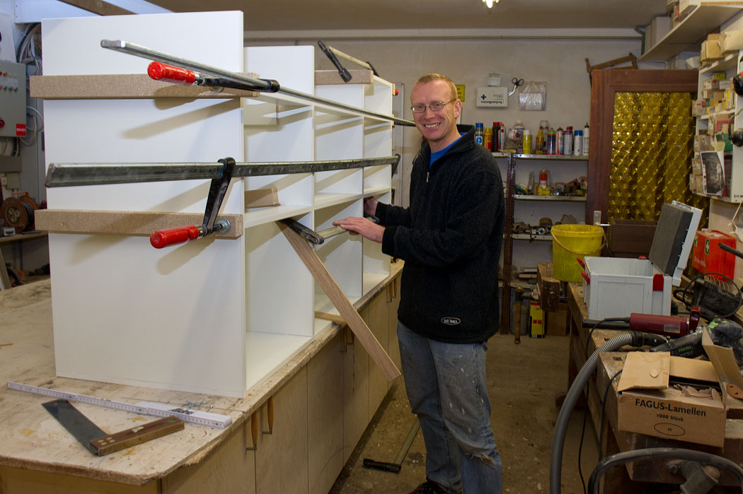 Oberschränke: Ich begann also erst einmal mit dem Bau der Oberschränke. Die Platten waren fertig zugeschnitten und mit Umleimer belegt. Mit Hilfe einer Lamello Fräse (10er Lamellos) und großen Schraubzwingen war das eine Herausforderung, die leisten war. Mit Sikaflex 252i und etlichen Schrauben waren die Oberschränke schnell an die Decke gebracht. Die größte Herausforderung war der Bau des Küchenschranks.
