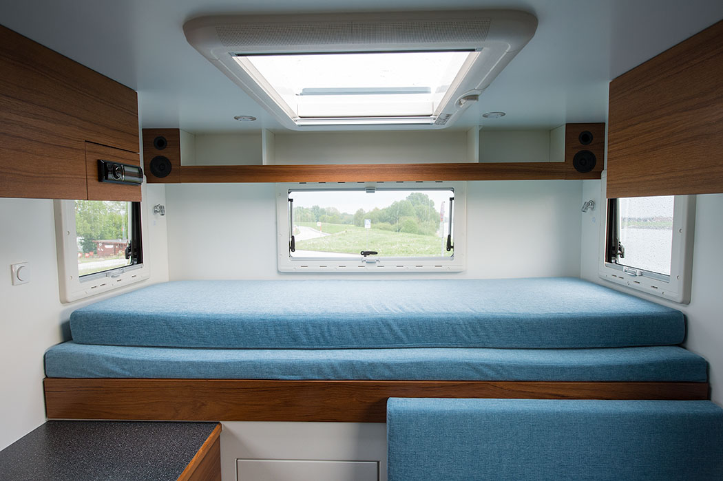 Bett: Beim Bett haben wir uns für ein Ausziehvariante mit dem "Froli System" entschieden. Damit alles gut und leicht gleitet, liegt auf dem Staufach eine glatte HPL Platte. Alle anderen Teile der Konstruktion sind ebenfalls mit glattem HPL beschichtet. Als Trägermaterial habe ich diesmal Multiplex Platten gewählt, damit die Konstruktion stabil wird und nicht die Schrauben ausreißen. Der ausziehbare Teil ist mit einem 2mm Aluwinkel verbunden auf den aus Teak / Multiplex eine Blende geschraubt ist. Konstruktionsbedingt ist die hintere Matratze 9cm stark und die vordere 10cm. Wir haben normalen Schaumstoff gewählt, da dieser deutlich leichter als Kaltschaummatratzen ist und für Kaltschaum eine Höhe von 14cm erforderlich ist, was uns zuviel ist. |