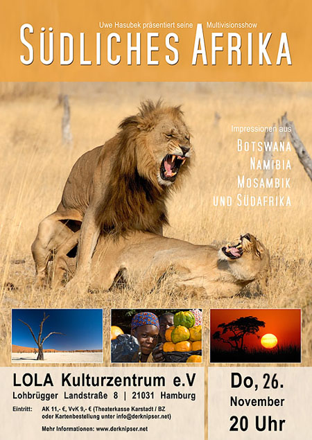 Neben der unglaublichen Tierwelt Botswanas und Südafrikas, präsentiere ich Ihnen mit spektakulären Bildern die Highlights des südlichen Afrikas. Ich erzähle Ihnen von den Begegnungen mit Walhaien vor der Küste Mosambiks, nehme Sie mit auf einen Rundflug über die Victoria Fälle in Zimbabwe und entführe Sie in den äußersten Nordwesten Namibias - in das wilde Kaokoveld. Auf abenteuerlichen Piste dringen wir in eines der entlegensten Gebiete dieser Welt vor und vorbringen dort phantastische Tage. Ein absolutes Highlight sind die roten Dünen der Namib, die im Bereich des Sossusvleis bis zu 300m hoch sind und ein unvergessliches Erlebnis einer jeden Reise ins südliche Afrika sind. Aber ich will nicht zuviel verraten...