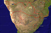 Der Rest der Reise ist wieder mit viel Fahrerei verbunden. Über die traumhafte Wüstenlandschaft des Sossusvleis, das uns bereits bei unserer letzten Reise völlig begeistert hat, geht es im Eiltempo zurück nach Johannesburg. Insgesamt kanpp 10.000 Kilometer werden auf den Straßen und Pisten Afrikas unterwegs sein und mit vielen, hoffentlich beeindruckenden Fotos, zurückkehren. Unseren Reiseverlauf könnt ihr der Karte verfolgen (gestrichelte Linie).