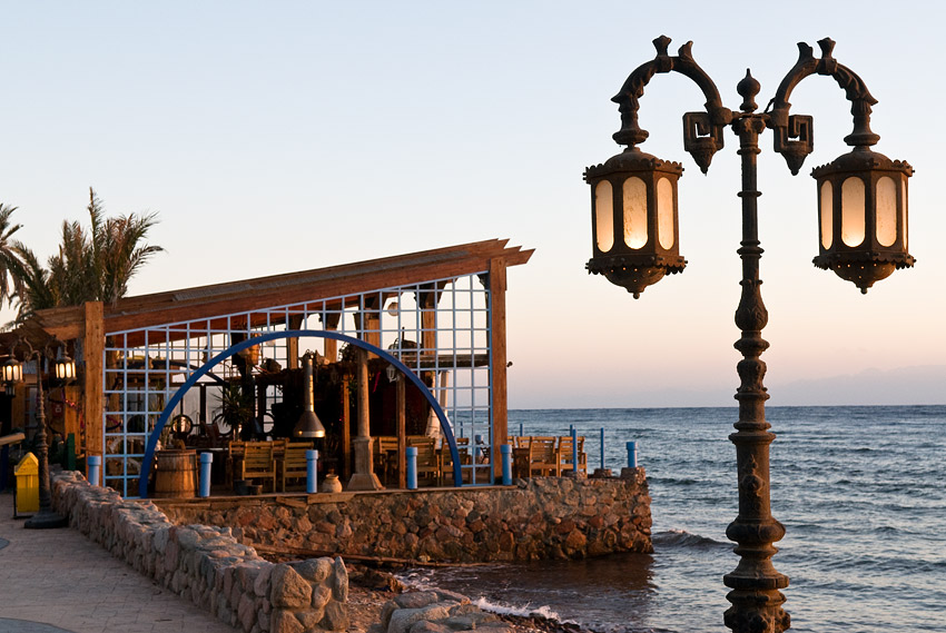 An diesem ersten Tag hatten wir noch kein Programm und konnten so in Ruhe durch Dahab bummeln. Zuerst gingen wir die Strandpromenade entlang in Richtung Ort. Dort reihen sich jetzt die Hotels, die Anbieter von Wüstentouren, Internetcafés und kleine bunte Läden aneinander. An der Wasserseite sind lauter bunte Restaurants, die oft nur mit Hilfe großer, farbiger Stoffbahnen den Wind vom Meer abhalten. Sie sind in der Regel in kleinere und größere Sitzkreise eingeteilt, die mit Flickenteppichen und Matrazen ausgelegt sind. Die Tischbeinhöhe beträgt ungefähr 20cm. In manch einem Restaurant gibt es abends offene Feuer, überall jedoch sind Katzen als Resteverwerter und Schnorrer unterwegs. Für die älteren, rückenkranken Touristen gibt es auch einige normal hohe Tische mit Stühlen.