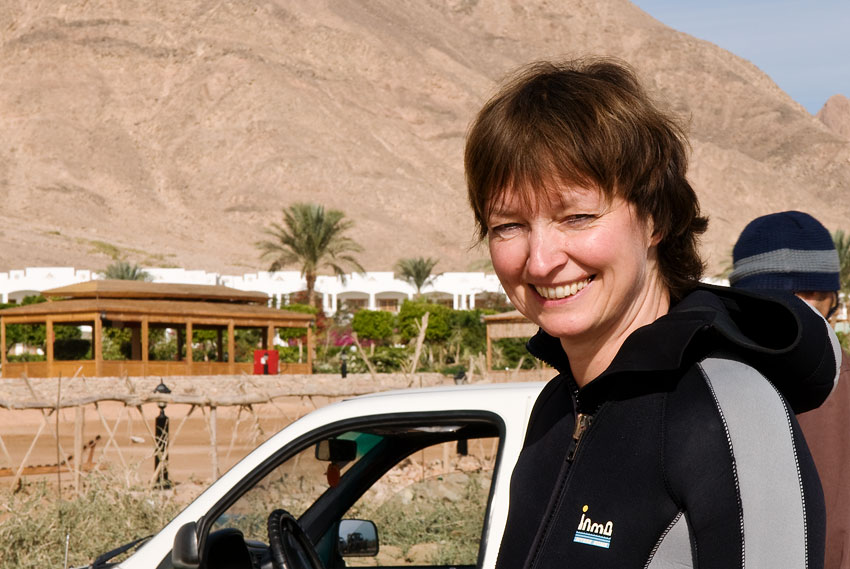 Nach der Mittagspause sollte es dann um 14 Uhr weitergehen. Wie sich das gehört, war ich um 13.50 Uhr am verabredeten Ort, packte mein Tauchequipment zusammen, damit wir um 14 Uhr pünktlich starten konnten. Von Harald weit und breit keine Spur. Um 14.10 Uhr tauchte er auf und erwiderte auf, dass er sich wohl schon zu sehr an die arabische Mentalität gewöhnt habe. Außerdem teilte er mir mit, dass er ein massives emotionales Problem habe. Dies konnte ich auch von meiner Seite nur bestätigen. Na das konnte ja lustig werden. Nachdem er dann noch 20 Minuten brauchte um den Neoprenanzug anzuziehen und sich mit dem nötigen Tauchequipment zu beladen war meine Geduld endgültig am Ende.