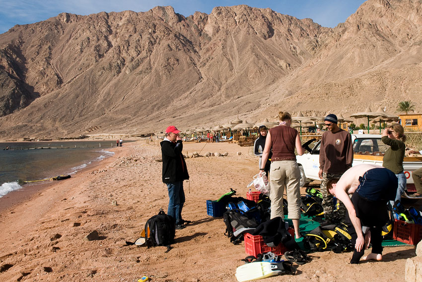 Ziel des Aufenthalts in Dahab war ein Tauchkurs mit dem Zertifikat „Open Water Diver“. Ich wollte endlich einmal lernen, die Unterwasserwelt direkt bewundern zu können. Aber bevor es soweit war, musste noch die eine oder andere Hürde genommen werden. Meine Hürde hieß Harald – ein 47 jähriger Datenbankprogrammierer aus NRW, der die Langsamkeit neu für sich erfunden hatte und ebenfalls in dem Tauchkurs war. Jeder der mich kennt, weiß, dass das eine der größten Herausforderungen für mich ist. Wir begannen um 10 Uhr mit den ersten zwei Videolektionen, die 1.30 Uhr dauern sollten. Harald merkte gleich an, dass 1.30 Uhr doch recht lang sei und er gerne nach der ersten Lektion eine Pause machen wollte, um die Informationsfülle mental verarbeiten zu können. Nach nur 35 Minuten bat er um eine Pause, da er aufs Klo musste. Natürlich musste er nach seiner Rückkehr auch noch dringend eine Zigarette rauchen, bevor es weitergehen konnte. Nur 10 Minuten später war die erste Lektion beendet und Harald forderte die bereits zu Beginn erbetene Pause ein. Ich war innerlich und vermutlich auch äußerlich am Kochen. Thomas, ein Schweizer, der ebenfalls an dem Kurs teilnahm, verdrehte nur die Augen…