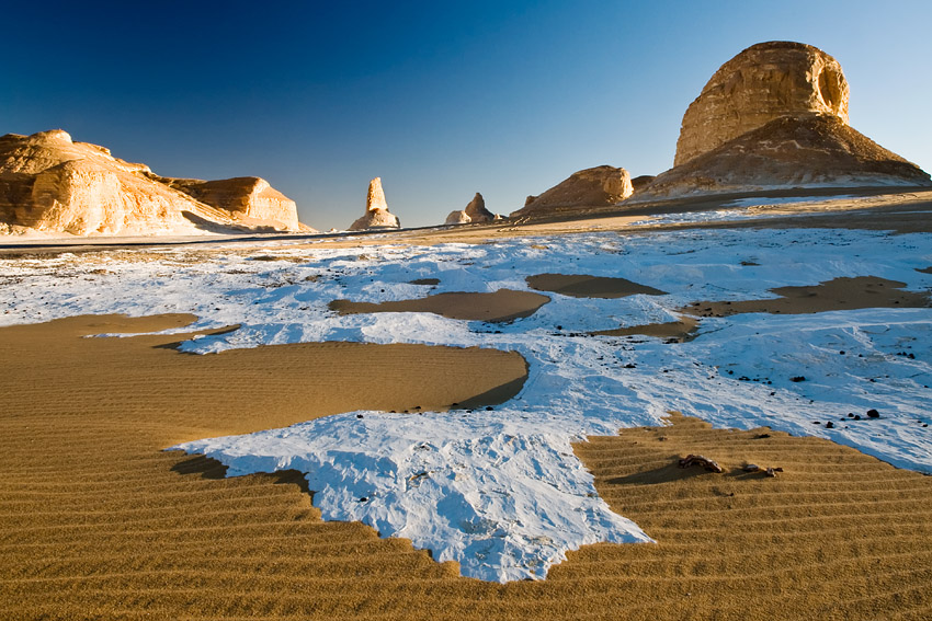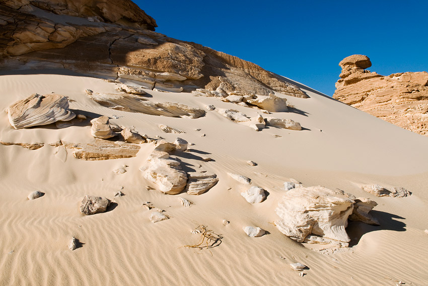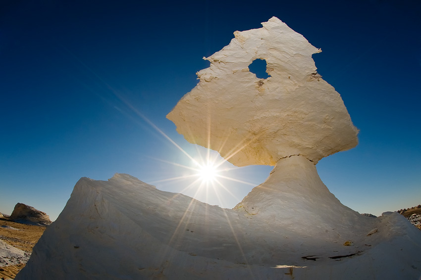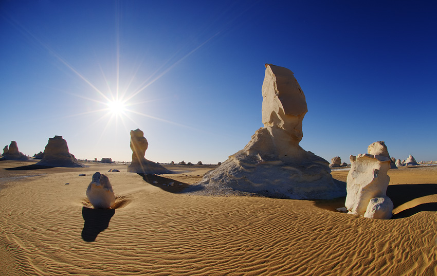 Am nächsten Morgen krochen Silke und ich mit den ersten Sonnenstrahlen aus dem Zelt, schulterten die Fotorucksäcke samt Stativ und machten uns auf die Suche nach noch unberührten Stellen. Was aber ist die Weiße Wüste eigentlich? In der Weißen Wüste hat die Erosion phantastische Kunstwerke geschaffen, indem sie den weicheren Stein um einen härteren Kern durch jahrmillionenlanges Sandstrahlen entfernte. Das riesige Areal ist mit Kalksteingebilden übersät, in denen auch phantasielose Leute die tollsten Märchengestalten entdecken können. Es ist einfach wunderschön durch diese Kunstausstellung der Natur zu wandern und diese skurrile Welt zu bewundern, in der die Erosion einfach so Säulen, Pilze und Skulpturen in eine weite Ebene stellt oder den kaltweißen Kalkboden wie Schneewehen oder als „stürmische See“ gleichsam erstarren ließ.