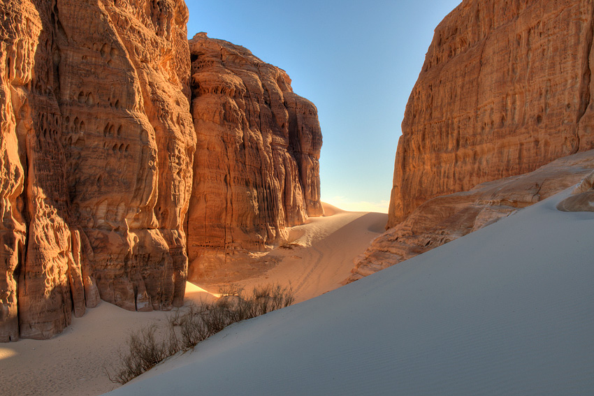 Pünktlich um 7.30 Uhr wurden wir von einem sehr netten Führer und einem muffligen Beduinen abgeholt. Nach einigen Polizeikontrollen, die auf dem Sinai zum Tagesgeschäft gehören, verließen wir nach knapp einer Stunde die Asphaltstraße und befanden uns plötzlich auf einer tiefen Sandpiste, die uns zum Beginn des White Canyons – unserem ersten Ziel - führen sollte. An einer kleinen Steigung blieb unser Fahrer mit dem Allrad getriebenen Toyota Landcruiser stecken. Auch bei einem zweiten Versuch kam er nicht viel weiter. Wir sollten aussteigen und ich ging davon aus, dass er es noch einmal mit ein bisschen weniger Gewicht versuchen wollte. Nichts Böses denkend verließen wir mit den Fotoapparaten (ohne Fototaschen) das Auto, um die Zeit sinnvoll für ein paar Fotos zu nutzen. Unserer Fahrer fuhr zurück, wendete und verschwand am Horizont. Auf Nachfrage hieß es, dass er sich auf den Weg in die Oase Ain Khudra, wo wir uns nach der Wanderung durch den White Canyon wieder treffen wollten, befinde. Ich konnte es nicht glauben – wir wollten durch einen engen Canyon wandern ohne Stativ, Fototaschen und weiteres Equipment. Meine Laune sank trotz des tollen Canyons auf den Nullpunkt. Dem jungen, unerfahrenen aber dafür sehr bemühten Führer war die Situation extrem peinlich. Er entschuldigte sich mehrfach, konnte uns aber aus dem Dilemma nicht helfen. So stapfte ich knurrend durch den ansonsten sehr schönen White Canyon, ohne auch nur ein gutes Foto gemacht zu haben. Nach einem mittelmäßigen Mittagessen ging es weiter in Richtung Matamir Mountains, von denen ich zuvor sehr schöne Fotos gesehen hatte. Zuvor wollten wir aber noch ein paar Dünen aus der Nähe betrachten. Aber auch diese Dünen fanden die sog. Führer / Fahrer nicht wirklich. Als sich der Trottel dann noch einmal im Sand festgefahren hatte, erklärte ich ihm die Funktionsweise eines Allradfahrzeuges. Dass das Fahrzeug außer dem normalen Allradantrieb auch noch ein Untersetzungsgetriebe und Differentialsperren besitzt, war ihm zwar bekannt, aber diese sollte man angeblich nicht im Sand einsetzen. Nach einigen Diskussionen schaltete er dann doch das Untersetzungsgetriebe dazu und das Auto bewegt sich auf wundersame Weise in die gewünschte Richtung – Beduine bleib bei deinen Kamelen…