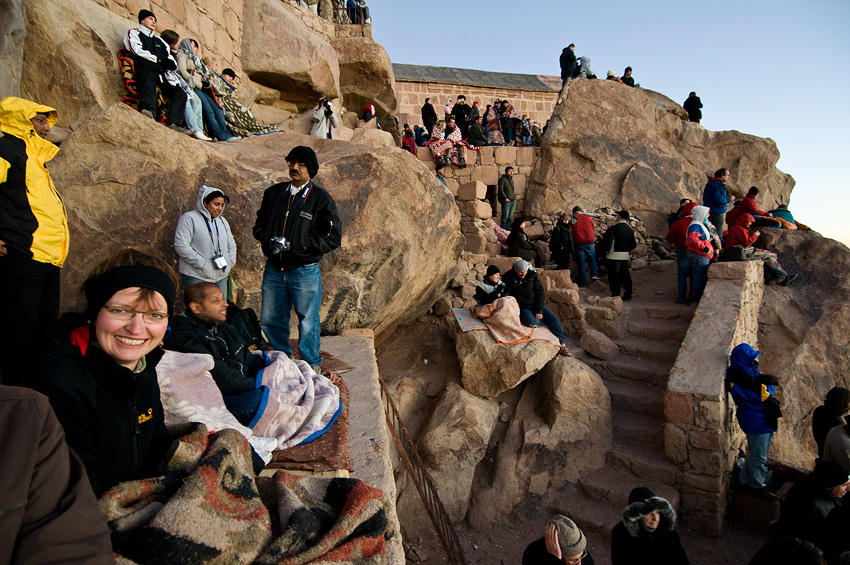 Nachdem wir schon einiges über den angeblich wunderschönen Sonnenaufgang am Mount Sinai gehört hatten, machten wir uns des Nachts auch auf den Weg in Richtung Katharinenkloster, das am Fuß des Mount Sinai gelegen ist. Um 23 Uhr ging es in einem bis auf den letzten Platz besetzten Minibus los. Man mag es kaum glauben, aber in ein Fahrzeug der Größe eines VW Busses passen in Ägypten 15 Personen rein. Dementsprechend bequem saß man dann auch. Um 1 Uhr nachts erreichten wir das Katherinenkloster und machten uns in unserer Kleingruppe samt Führer auf zum Gipfelsturm. Nach nur einer halben Stunde buchten die ersten ein Kamel, das sie den Berg hinauf tragen sollte. In einem eher gemächlichen Tempo ging es bei nahezu Vollmond den Berg hinauf. Die letzten gut 30 Minuten muss man über Steinstufen sich gen Himmel schrauben. Um 4 Uhr waren wir und ca. 400 andere Touristen auf dem Gipfel und richteten uns bei eisiger Kälte auf die Nachtruhe ein. Mit einer geliehenen Decke und Matratze – die Ägypter haben vermutlich schon seit vielen Jahren diese Marktlücke entdeckt – zitterten wir dem Morgengrauen entgegen.