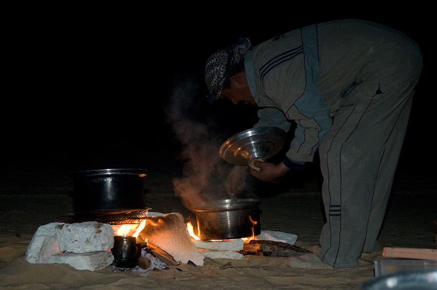 Das Auto, ein Toyota Landcruiser, ist zwar vom Prinzip her eines der besten Fahrzeuge für die Wüste, aber wenn die Karre 486.000 km auf dem Tacho hat, fragt man sich doch, ob es die allerbeste Wahl ist… Aber wir hatten ja Abenteuer gebucht und das sollten wir dann wohl auch bekommen. Kurz hinter dem Kontrollposten vor Managem sollten wir auf unseren Fahrer treffen. Als wir nach 4 Stunden den verabredeten Treffpunkt erreichten, war von unserem neuen Fahrer nichts zu sehen. „He will be here in 5 minutes“ – aus den 5 Minuten wurden 30 Minuten, aber dann endlich kam ein voll gepackter Landcruiser um die Ecke. Heraus sprang ein in Beduinentracht gekleideter Mann, der sich als unser Fahrer herausstellte. Nach einem kurzen „Hallo“ begann eine große Umpackerei und plötzlich war unser Fahrzeug mehr oder weniger „fully equipped“. Da wir nicht nur in die „Weiße Wüste“ besuchen sondern auch echtes Wüstenfeeling mit Sanddünen erleben wollten, fuhren wir wieder 15km zurück in Richtung Kairo und bogen dann in westlicher Richtung von der Asphaltstraße ab. In nicht allzu weiter Entfernung sahen wir die ersten Sanddünen. Shokry – unser Fahrer – hielt an, drehte die Differentialsperren rein, lies auf allen Reifen die Luft ab und ab ging die Post. Mit Tempo 80km/h raste er auf die Dünen zu. Als der Sand tiefer wurde knallte er den Allradantrieb rein und fuhr bis auf die Spitze einer Sanddüne hoch. Oben hielt er souverän vor der Abfahrt und begutachtete die extrem steile Abfahrt – wir entschieden uns da nicht runter zu fahren. Von diesem Moment an wussten wir, dass Shokry nicht das erste Mal im Sand fährt und dass wir eine gute Wahl getroffen hatten. Lediglich seine Englischkenntnisse waren eine Katastrophe. Er befand sich ungefähr auf dem Stand unserer Schüler nach 6 Monaten Englischunterricht in Klasse 7. Konversation mit Händen und Füßen war angesagt. Wir drehten also wieder um und bauten unser Camp am Fuß der Dünen auf, wo wir ein wenig vor dem kühlen Wind geschützt waren. Fotos vom Sonnenuntergang waren uns allerdings nicht vergönnt, da es doch tatsächlich bewölkt war. Auf Nachfrage bei Shokry wie denn das Wetter morgen werden würde, prognostizierte er Sonnenschein - „Inchallah - So Gott will“. |