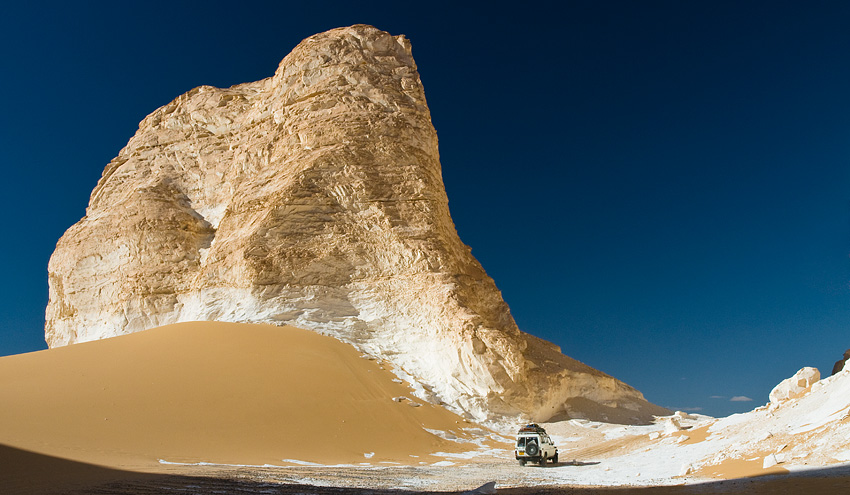 Leider konnten wir da nicht campieren, da man angeblich in diesen Teilen des Western Deserts ein Permit brauchte. Wir fuhren also wieder zurück in die Weiße Wüste. Bei völliger Dunkelheit – wir befanden uns kurz vor Neumond – bog Shokry kurz hinter Farafra von der Asphaltstraße ab und fuhr knapp 40km durch die dunkle Nacht. Ich hatte am Morgen den Übernachtungsplatz auf dem GPS markiert und konnte so sehen, ob Shokry in die richtige Richtung fährt. Ich weiß beim besten Willen nicht, wie er das gemacht hat, aber wir kamen genau an der geplanten Stelle raus. Er fragte mich zwar immer mal wieder wie viele Kilometer es noch seien, aber er fuhr ohne die Hilfe von nur irgendeinem technischen Gerät. Abgesehen von einem Zwischenstopp – er stellte den Motor ab, stieg aus, rauchte eine Zigarette und bestimmte die Richtung für die Weiterfahrt – kamen wir auf direktem Weg an unserem Ziel an. Shokry war unheimlich stolz auf sich und wir standen nur fassungslos davor.