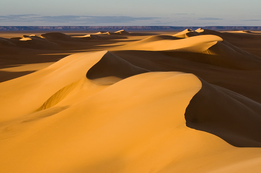Als wir ins Camp zurückkamen brannte das Feuer und der Tee und das Frühstück waren vorbereitet. Wir genossen die Stimmung und machten uns gegen Mittag zu einer Rundfahrt durch die Weiße Wüste auf. Wir fanden eine tolle Stelle, wo wir unbedingt die Nacht verbringen wollten. Zunächst aber ging es durch die Oase Farafra und dann weitere 120km in südlicher Richtung, wo es noch einmal hohe Sanddünen geben sollte. Mich faszinieren die Lichtspiele, die die unter- bzw. aufgehende Sonne in die gelben Sanddünen zaubert, immer wieder aufs Neue. Nachdem den ganzen Tag kein Wölkchen am Himmel war, bildeten sich doch kurz vor Sonnenuntergang ein paar Wolken, die die Sonnen größtenteils verdeckten. Aber es gelang mir doch ein paar schöne Shots zu machen, die einen zum Träumen verleiten. |