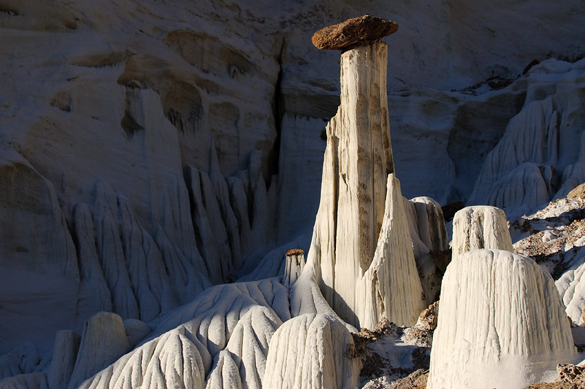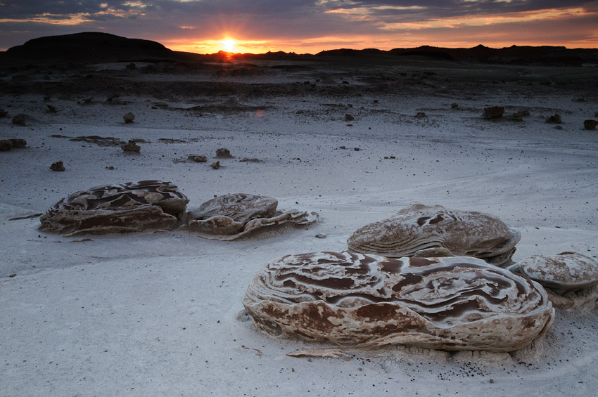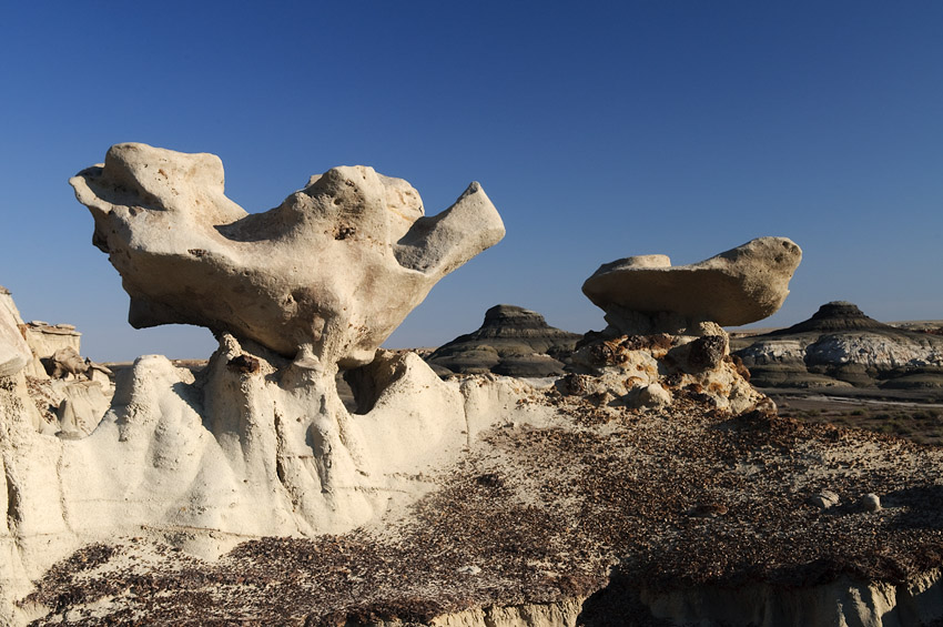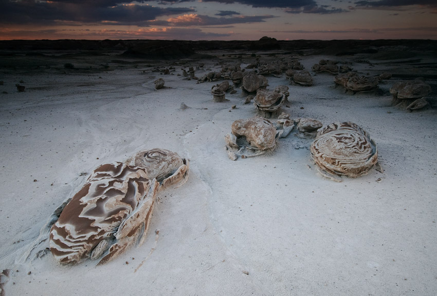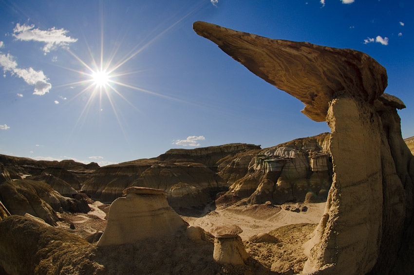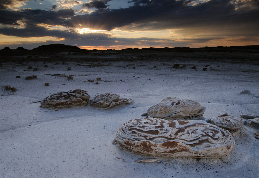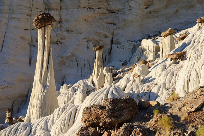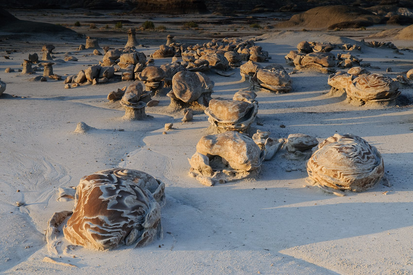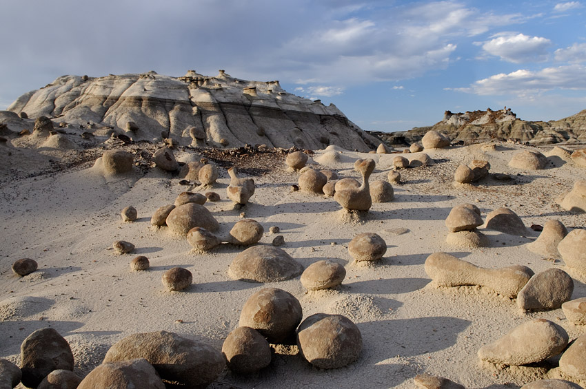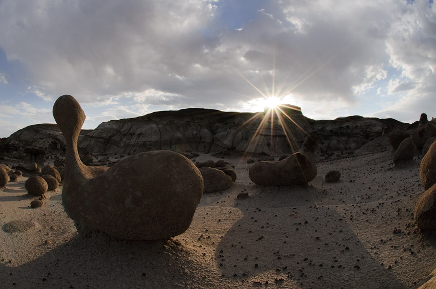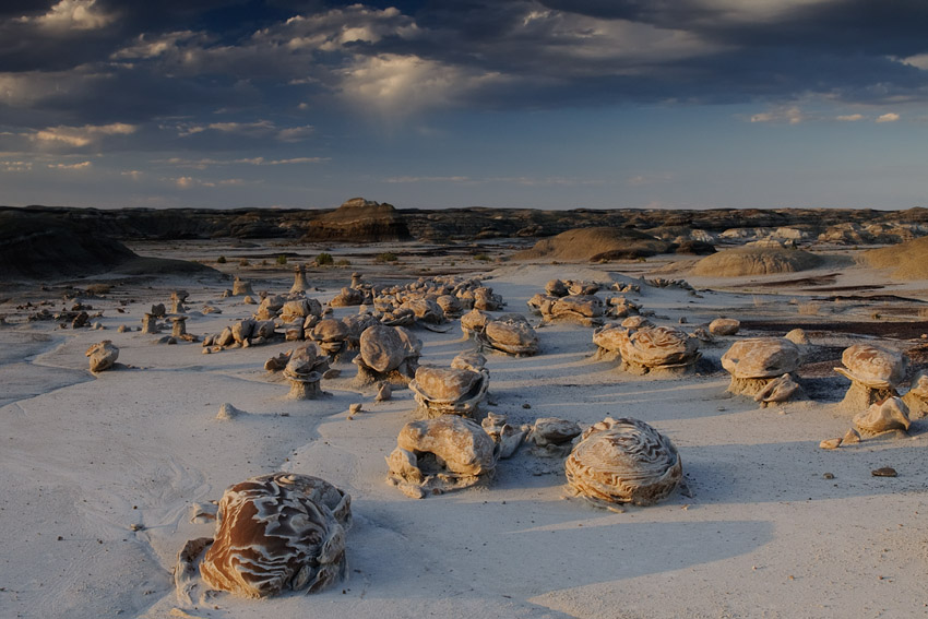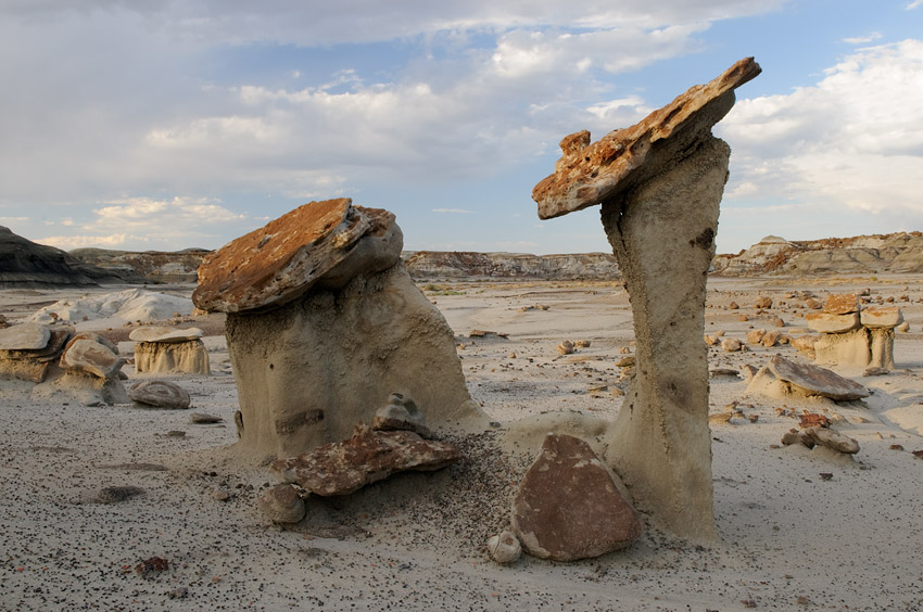 In diesem Urlaub neigen wir zum Verschlafen. Das ist gar nicht unsere Art. Die Nacht war so herrlich kühl, dass wir wieder etwas zu spät aufwachen. Ohne Frühstück, im Laufschritt geht es also wieder in das riesige Gebiet der Bisti Wilderness. Der Himmel spielt nur zum Teil mit. Aber wir lassen uns nicht erschüttert. Es wird geknipst, was das Zeug hält.