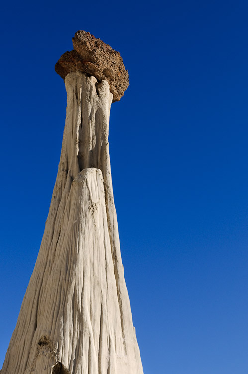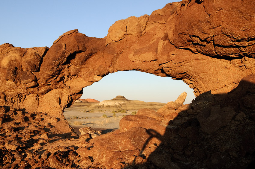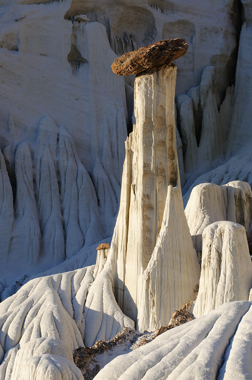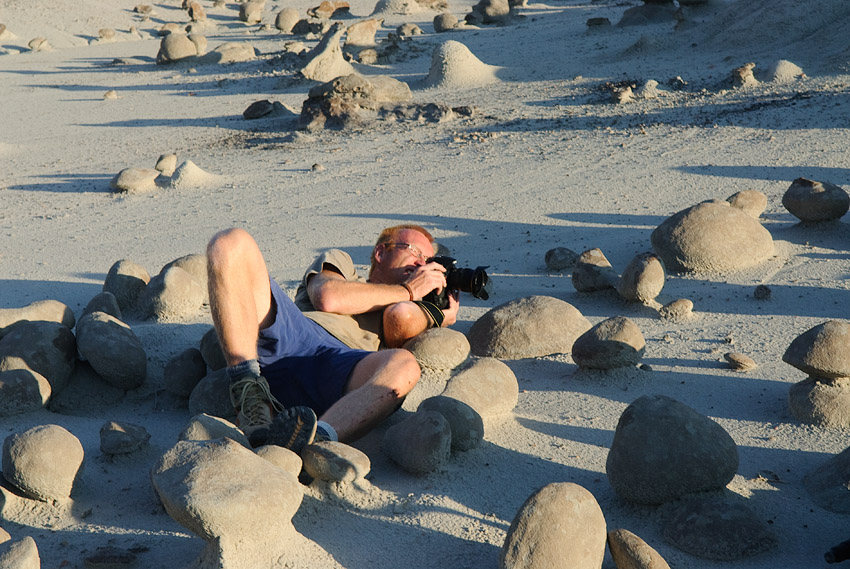 Wir suchen uns zwischen 3 Hügeln einen Platz zum Zelten, der uns zumindest ein wenig geschützt vorkommt. Dann packen wir unsere Fotoausrüstung und ziehen los. Wir haben einige GPS-Daten, die uns zu sehenswerten Steinformationen führen sollen. Zuerst sind die Choko-Hoodoos dran. Zielstrebig folgen wir bei gleißendem Sonnenschein unserem GPS. Der Punkt ist erreicht, aber keine Hoodoos in Sicht. Wir suchen und suchen. Schließlich geben wir auf. Uwe kann es nicht glauben. Hat er die Daten falsch eingegeben? Waren die Ursprungsdaten in einem anderen System angegeben? Er grübelt.