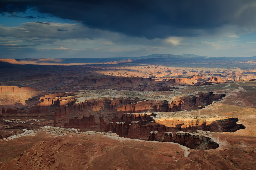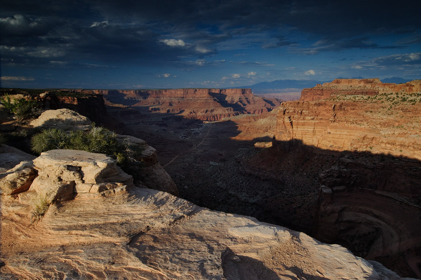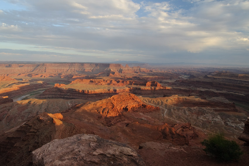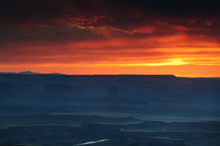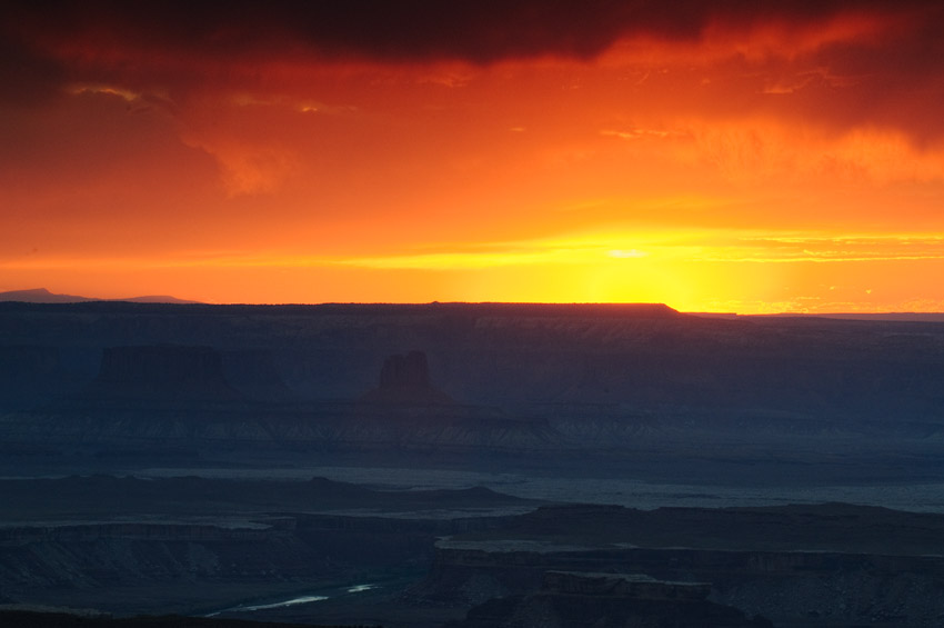 Wir fahren von Norden her (Island in the Sky) in den Canyonland Nationalpark hinein und finden auch gleich einen Zeltplatz. Um den Sonnenuntergang noch zu genießen, fahren wir zum Grant View Point Overlook. Hier machen wir sehr schöne Fotos. Auf dem Rückweg halten wir noch an einem weitern Übersichtspunkt, von dem aus man die Sonne in einem sagenhaften Orange untergehen sieht. |