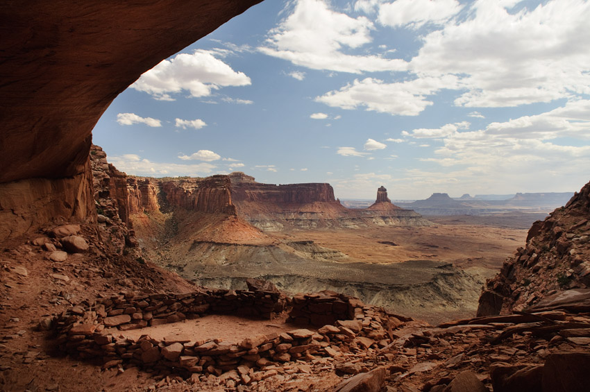 Gegen 15 Uhr am Nachmittag machen wir uns auf, die False Kiva zu erforschen. Uwe hat hiervon mit viel Mühe eine Beschreibung erhalten, nachdem er über ein Foto davon gestolpert ist. Es ist ein wenig schwierig, den Trailhead, also den Beginn des Wanderweges, zu finden. Aber mit einem Tipp der Rangerin aus dem Visitorcenter klappt es. Die Sonne knallt, aber es geht erstmal bergab. Ein wenig Kletterei ist auch dabei. Die Landschaft wird immer gigantischer. Man hat einen Einblick in den unendlich weiten Canyon des Green Rivers. Nach einiger Zeit sieht man auch die eindrucksvolle Wand, in der sich die False Kiva befindet. Es handelt sich hierbei um eine Felshöhle, die nach vorne hin offen ist. Man hat anfänglich wohl gedacht, dass es sich hierbei um eine Kultstätte der Indianer gehandelt hat. Inzwischen weiß man aber, dass sie dort gegessen und gewohnt haben. Diese Höhle liegt recht hoch in einer gigantischen Felswand. Glücklicherweise gibt es aber einen gut begehbaren Wanderweg dorthin.