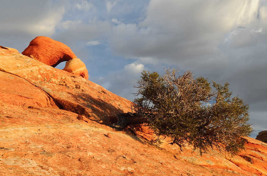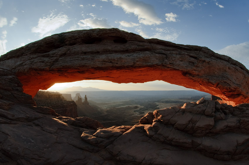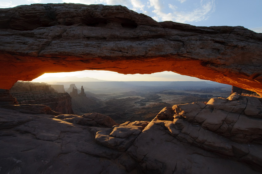 Damit wir nicht wieder verschlafen, wird jetzt der Handywecker gestellt. Es klappt. Pünktlich um Viertel vor sechs Uhr stehen wir auf dem Parkplatz, von dem der Weg zum Mesa Arch abgeht. Gestiefelt und gespornt ziehen wir los. Eine viertel Stunde später stehen wir am Mesa Arch und warten darauf, dass die Bewölkung die langsam am Horizont aufgehende Sonne freigibt. Es soll sich dann ein herrliches Rot an der Unterseite des Bogens bilden. Die Wolken mögen uns aber. Nachdem ich schon eingepackt habe, zeigt sich die Sonne doch noch ein wenig. Ich bekomme eine kleine Idee, wie das mit dem Rot wohl gehen könnte.