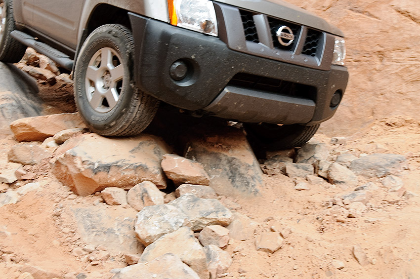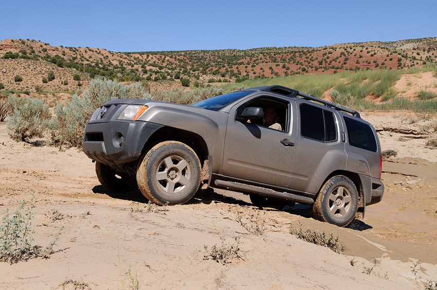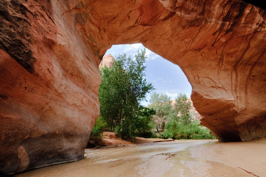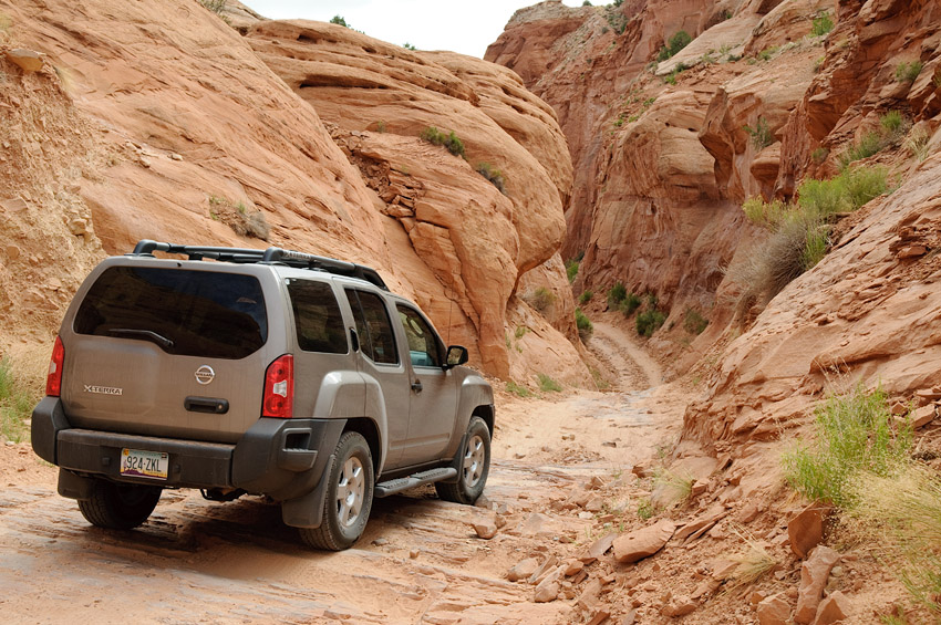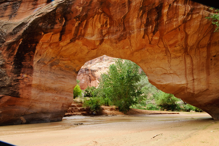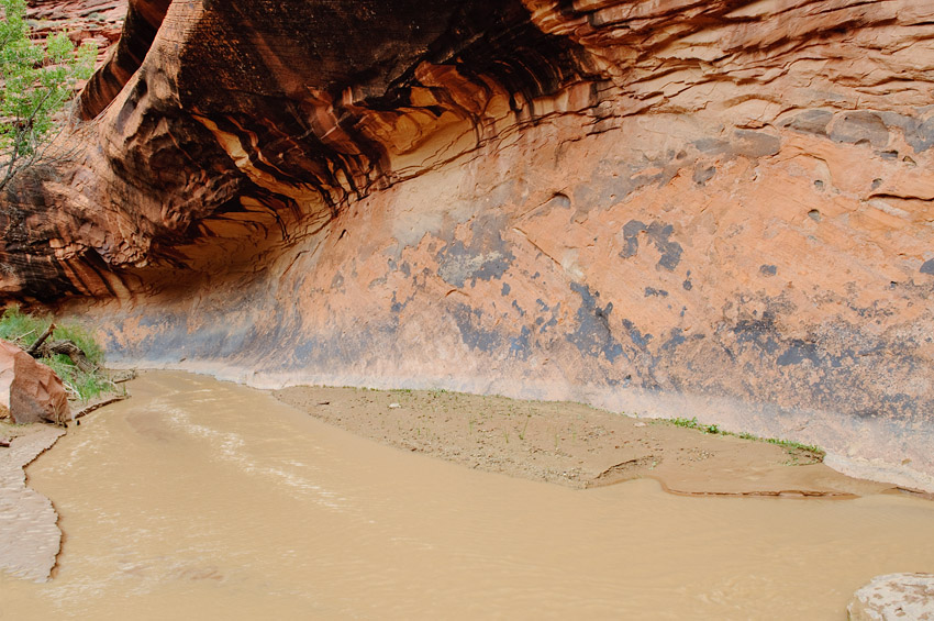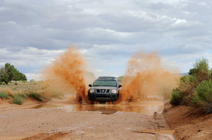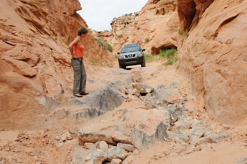 Wir fahren jedoch der Sonne entgegen. Damit das so bleibt, beschließen wir, uns das „Hole in the Rock““ anzuschauen. Wir fahren und fahren. Die Straße ist recht abwechslungsreich. Mal Slickrock, mal roter Sand, mal festes Waschbrett, Flussdurchfahrten usw. Ca. 6 Meilen vor unserem Ziel steht die Straße dann das erste Mal so richtig unter Wasser. Das kennen wir aus Afrika. Wir umfahren die Stelle und kommen bald an die nächste. Der Slickrock, über den wir fahren müssen, wird immer unebener. In Anbetracht der Wetterlage - die dunklen Wolken nähern sich – und der steilen, rotsandigen Auf- und Abfahrten beschließen wir, umzukehren. Die Perspektive hier in dieser gottverlassenen Gegend festzustecken und womöglich mehrere Tage auf Trocknung bzw. Hilfe zu warten, lockt uns nicht. So fahren wir zum Startpunkt der Wanderung in den Coyote Gulch.