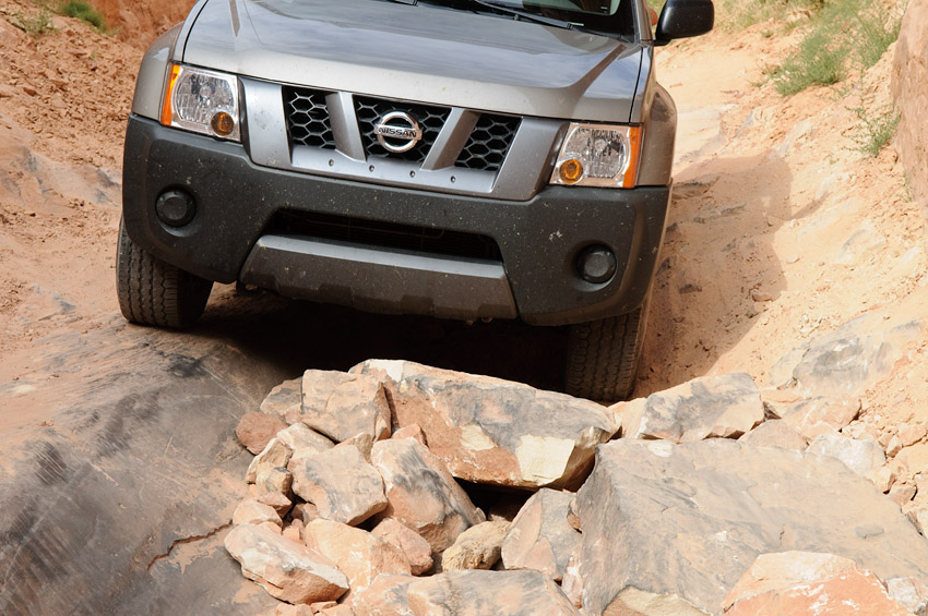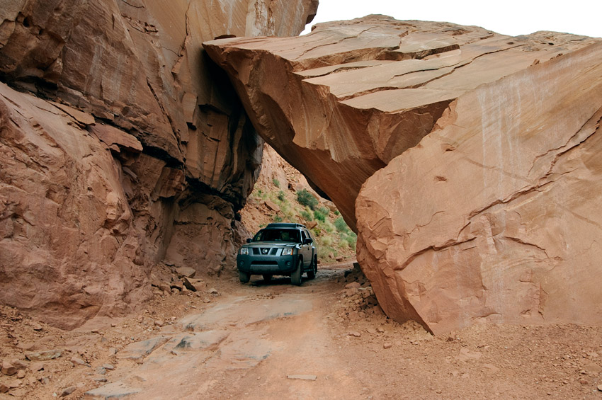 Um nach Moab zu kommen, nutzen wir eine Straße, die nur für 4Wheel Drive Cars zugelassen ist. Sie führt uns durch den „Long Canyon“. Rechts und links werden wir von gigantischen Steilwänden begleitet. Zu Beginn erscheint die Straße recht einfach befahrbar zu sein. Wir wundern uns über die Beschränkung. Nach einiger Zeit wird es dann aber doch etwas schwieriger. Uwe steigt aus und macht ein paar Fotos vom Auto und seiner Umgebung. Kurze Zeit später bestehe ich darauf, dass wir uns die Straße vor dem Befahren angucken. Und ich habe Recht. Die Straße ist ausgewaschen und dicke Felsblöcke liegen darin. Man muss sich sehr genau überlegen, wie man hier fahren will, wenn man heil unten ankommen möchte. Mir ist in Namibia am „Van Zyls Pass“ klar geworden, dass solche Straßen wohl für das Fahrzeug aber nur schwerlich für die Passagiere gefährlich sind. Man fährt ja extrem langsam und vorsichtig. Das Auto müsste denjenigen, der von außen dirigiert, schon überrollen oder umkippen, damit eine Person zu schaden kommen kann. Beides wollen wir verhindern. Uwe baut jetzt ein wenig an der Straße. Er packt ein paar Steine von hier nach da und wir überlegen, wie er lenken muss. Nach dem ersten Meter muss er aussteigen und erneut die Straße unserem Auto anpassen. Diesmal kommt er ganz rüber und wir zuckeln weiter. Dies war wohl die schwierigste Stelle, alle anderen können wir so meistern. Es gibt noch eine eindrucksvolle Fahrt unter einem riesigen umgestürzten Felsen hindurch. Von weitem wirkt es so, als würde das Auto gar nicht durchpassen. Dies ist aber zum Glück ein Irrtum. Die Landschaft um uns herum ist traumhaft. Nach einiger Zeit kommen wir an einer Asphaltstraße an und brausen mit dem letzten Rest Benzin nach Moab. |