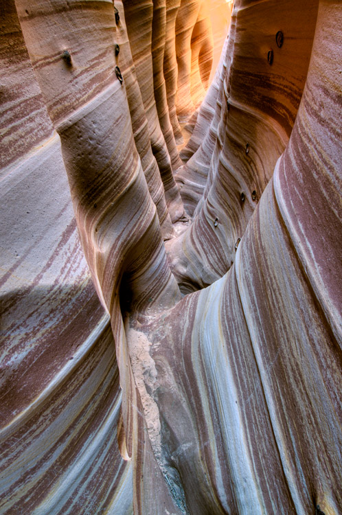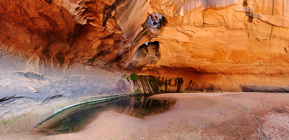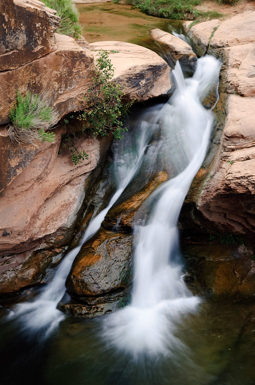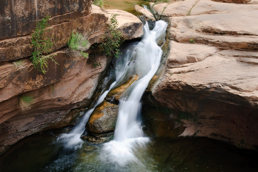 Wie Silke es schon gechrieben hat, eine Gruppe ist mir meistens zu langsam und so trennen sich bald unsere Wege. Wie immer wenn ich allein unterwegs bin, arten die Wanderungen in sportliche Aktivitäten aus, die meist recht schweißtreibend sind. So bin ich dann auch recht zügig unterwegs, nicht ohne die Schönheiten der Coyote Gulch zu genießen und natürlich fotografisch festzuhalten. Leider hat es in den vergangenen Tagen stark geregnet, so daß die Wasserfarbe eher dunkelrot als klar war. Ich weiß nicht, wie häufig ich den Creek durchquert habe, aber es waren unzählige Male und meine Schuhe waren nach der zehnten Durchquerung völlig durchnässt. Aus dem Internet habe ich mir die GPS Daten für den Aufstiegspunkt besorgt und stand nach 5 Stunden zunächst etwas ungläubig nach oben schauend an der Aufstiegsstelle. Die Felsen führten so steil nach oben, dass wenn man abrutscht man bestimmt das letzte Mal abgerutscht ist. Ein Seil wäre mit Sicherheit besser gewesen, aber was soll ich mit einem Seil, wenn ich alleine unterwegs bin... Um es kurz zu machen - ich bin nicht abgestürzt, wenngleich auch der Blick nach unten manchmal recht Angst einflößend war. Dennoch war es eine extrem beeindruckende Wanderung ab, die abseits des Mainstreams ist und damit von einer besonderen wilden Schönheit geprägt ist. |