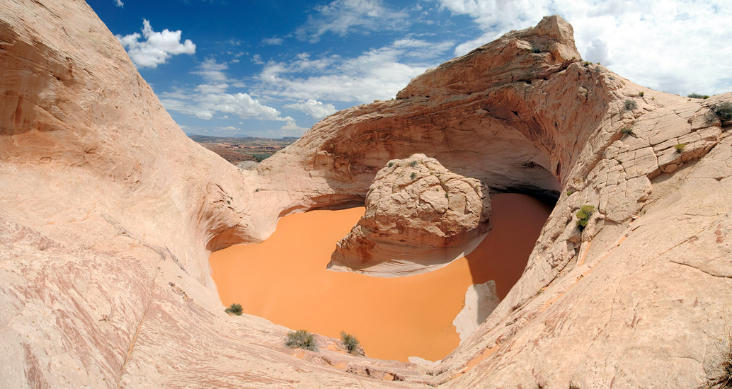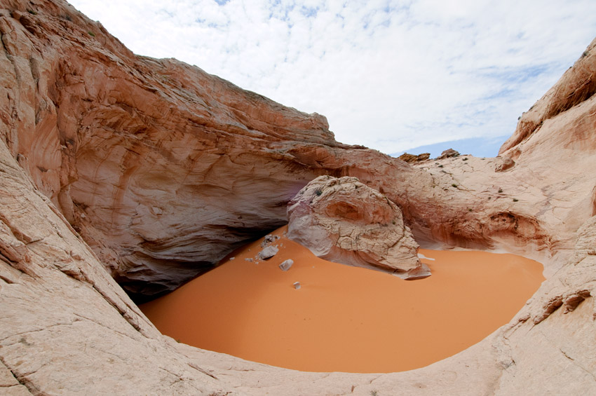 Der Weg über den Silckrock ist lang und heiß. Aber wir werden belohnt. Der Sandsteinkessel, der wirklich aussieht wie ein Vulkankrater ist mit orangem Sand gefüllt. Fast in der Mitte ragt ein hoher Sandstein heraus. Der Sand ist völlig ohne Spuren und das Ganze schaut aus, als wäre es extra für uns arrangiert worden. Wirklich einmalig! Uwe möchte das Ganze auch noch von der gegenüberliegenden Seite fotografieren. Er marschiert also los. Ich erhole mich erstmal von den Strapazen. Als er drüben angekommen ist, meint er, ich solle es doch einmal versuchen, anders herum um den Berg zu gehen. Das müsse einfacher sein. War es vielleicht auch. Nur leider habe ich den Einstieg in den Volcano nicht gefunden. Es dauert eine gute Weile bis wir uns wieder haben. Ergebnis der Geschichte ist, dass ich mich auf meinen nicht vorhandenen Orientierungssinn verlassen kann. Ich sollte in den Bergen nur in Begleitung unterwegs sein.