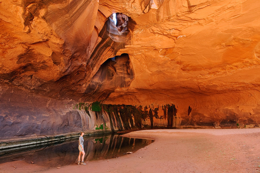 Endlich erreichen wir den Neoncanyon, den Eingang zur „Golden Cathedral“. Wir stapfen noch ungefähr 1,5 km durch den Canyon, der wunderschön von hohen rostroten Felswänden umgeben ist. Die Kathedrale ist dann fast ein bisschen enttäuschend. Eine hohe Felshöhle, die zu einer Seite ganz offen ist, mit zwei großen Löchern in der Decke, durch die wohl häufiger Wasser rauscht. Wir haben jetzt schon so viele Bögen und Höhlen gesehen, dass ich ein wenig abstumpfe.
