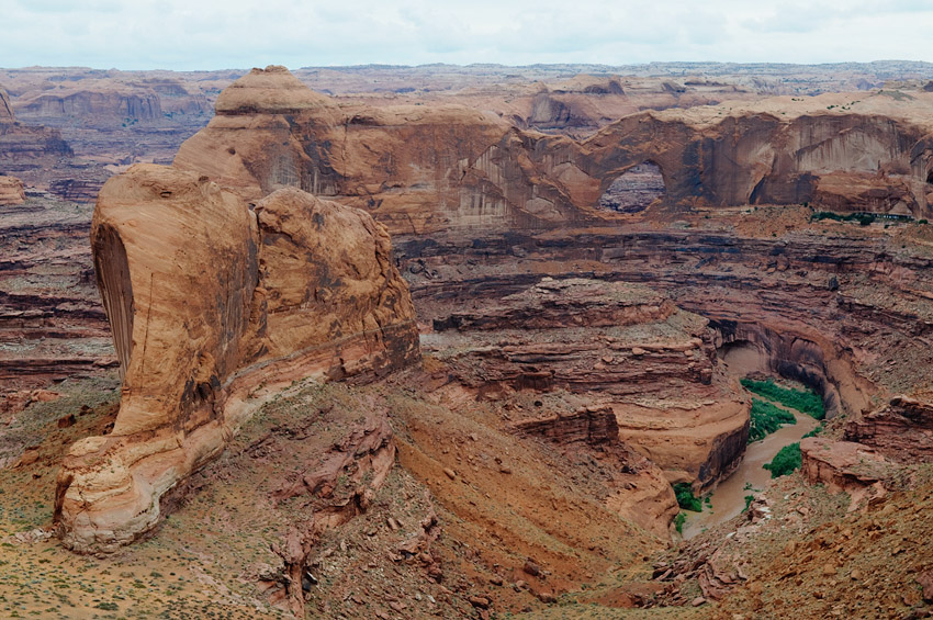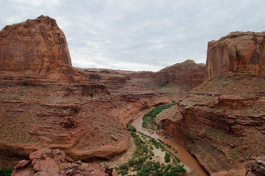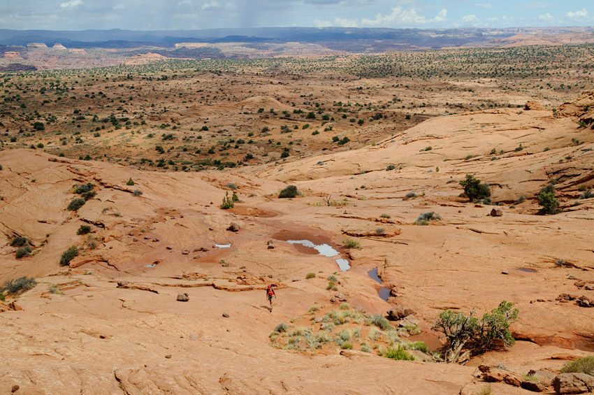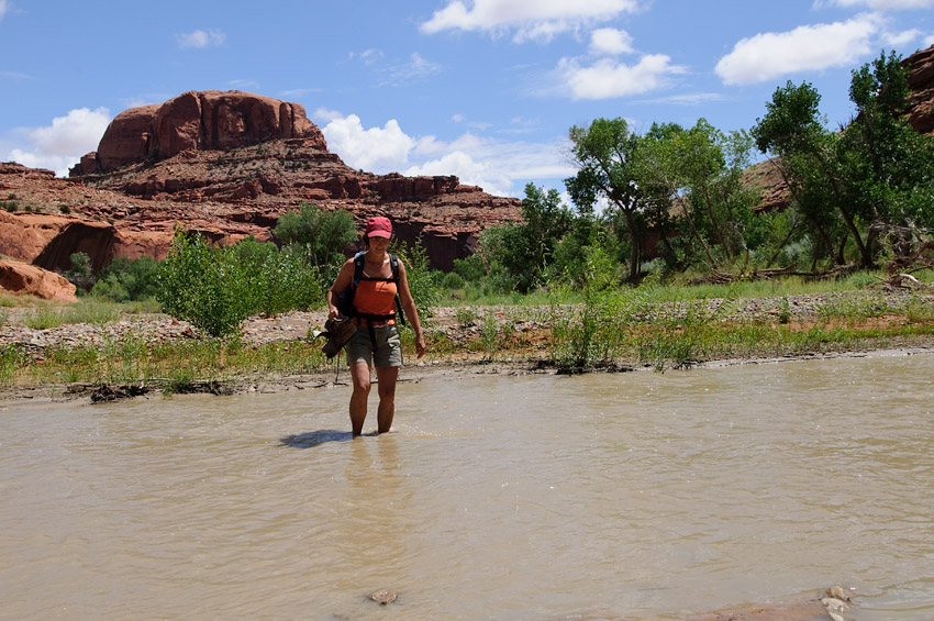 Für unser Auto bedeutet diese Straße zurzeit keine Herausforderung. Der Abzweig nach „Egypt“, dem Startpunkt unserer Wanderung, ist zwar in einem etwas schlechteren Zustand, aber wir kommen gut an. Die Wegbeschreibung haben wir beide oft gelesen. Es geht zuerst ca. 150 Höhenmeter über Slickrock bergab. Dann eine lange Zeit durch eine Ebene, die so eben nicht ist. Sand und Slickrock wechseln sich ab. Zum Glück ist es bewölkt und somit nicht so heiß. Irgendwann stehen wir am Canyon des Escalante River. Er liegt ca. 80 bis 100m unter uns. Auch hier wäre wieder gut fliegen zu können. Wir brauchen einige Zeit, bis wir einen Abstieg, der sogar mit Steinmännchen gekennzeichnet ist, finden. Uwe ist so zielstrebig, dass wir den Weg noch einmal verlieren und wieder an einer steilen Stelle stehen. Glücklicher Weise finden wir jedoch zum Weg zurück und sind bald unten. Der Escalante River wird von braunem Wasser durchflossen. Wir müssen ihn insgesamt 3 Mal durchqueren. Er ist ungefähr knietief und die Strömung ist gering. Am Uferbereich ist er sehr modderig und man versinkt ein wenig. Mit den Schuhen in der Hand kommen wir aber jedes Mal gut auf der anderen Seite an und dürfen uns dann wieder in die Socken und Schuhe quetschen.