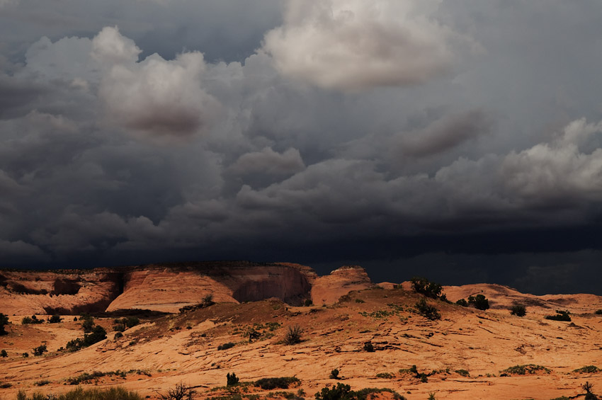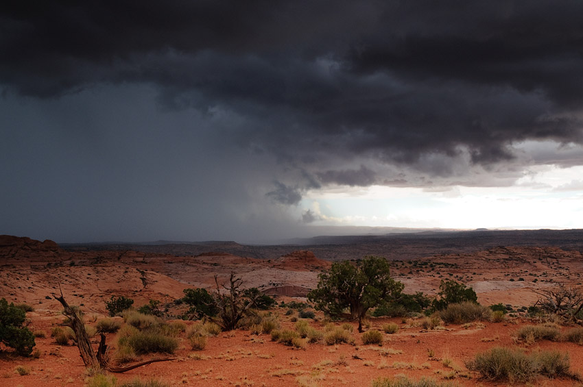 Da wir heute noch zum Startpunkt der morgigen Wanderung wollen, fahren wir zurück auf die „Hole in the Rock Road“. Der Himmel sieht gespenstisch aus. Von drei Seiten nähern sich dunkle Gewitterwolken. Wir hatten mit unserer Wanderung wirklich Glück, denn nur wenig später sehen wir, wie auf unserem letzten Parkplatz ein Platzregen niedergeht.