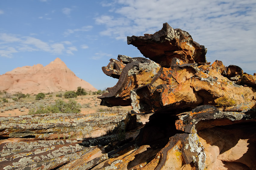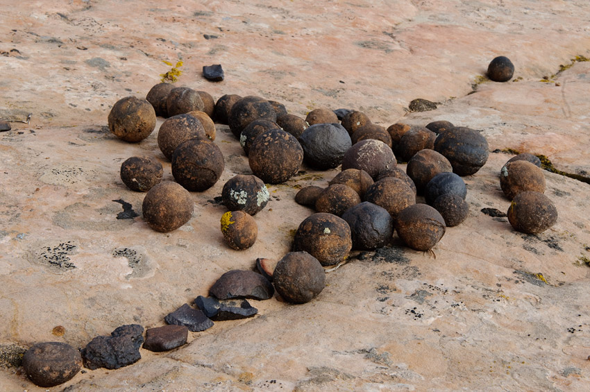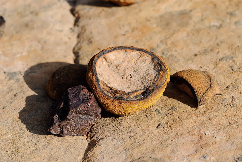 Nach einem Pancakefrühstück fahren wir in Richtung Escalante, biegen jedoch einige Kilometer vor dem Ort ab. Eine Dirtroad bringt uns dem Trailhead für die Tour zum Volcano entgegen. Leider ist die Straße 2 Kilometer vor unserer Beschreibung für den Verkehr gesperrt. Das heißt, wir müssen 4 km länger laufen als gedacht. Nun, was soll`s! Wir satteln unsere Rucksäcke und marschieren los. Anfangs geht es auf der Straße weiter, die teilweise recht sandig ist. Später wandern wir viel auf Slickrock, der zwar sehr fest aber dafür sehr hügelig ist. Die Strecke erscheint uns lang und länger, die Sonne strahlt und wärmt uns. Überraschend finden wir an einigen Stellen kleine schwarze Kugel, die aussehen, als seien sie aus Eisen. Uwe entdeckt dann auch eine offene Kugel, die innen mit hellem Gestein gefüllt ist. Inzwischen wissen wir, dass man die Dinger Moqui Marbles nennt. Außen befindet sich Eisenoxid, innen Sandstein. Entstanden sind sie wohl vor 6 bis 25 Millionen Jahren. Wir fotografieren die Kugeln, die an einigen Stellen richtige kleine Felder bilden. Manchmal sind sie so groß wie Murmeln, manchmal etwas größer.