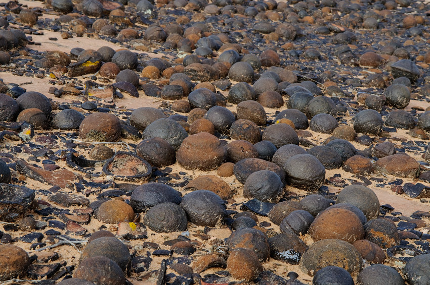 Um einen Felsen herum liegen die Kugeln in größeren Mengen herum. Viele sind aufgebrochen, andere mit bunten Algen bewachsen. Hier gibt es sogar welche, die die Größe eines Tischtennisballes aufweisen. Einige sind sogar noch ein klein wenig größer.