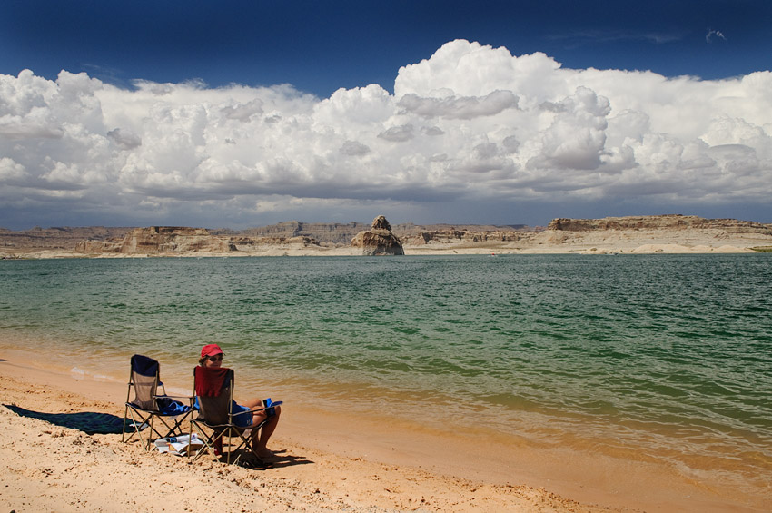 Uwe ist frustriert, ich finde das nicht so schlimm, da der Wetterbericht für Montag eh besser ist. Wir fahren in die Wahweap Marina, um uns nach den Bedingungen für eine Schiffsfahrt zur Natural Bridge zu erkundigen. Über 120 $ pro Person sind uns jedoch zu teuer. In Page kaufen wir ein und fahren danach an den Lone Rock Strand. Dort ist es sehr voll. Die Amis verbringen dort ihr Wochenende. Sie haben riesige Wohnmobile am Strand geparkt, viele große Autos parken dort, Schiffe liegen rum, sie fahren mit Quarts über den sandigen Hügel und mit Wasserskiern über den See. Die Attraktionen sind Jetskis, die mit Geknatter schon von recht kleinen Kindern gelenkt werden. Es ist ein buntes Treiben, das mit viel Lärm verknüpft ist. Das Wasser ist trotzdem herrlich. Wir beobachten das bunte Treiben. Uwe würde gern auch Jetski fahren. Unsere Nachbarn haben die Dinger aber nur geliehen, so dass er keine Chance hat, mal eingeladen zu werden. Als wir auf unseren Zeltplatz zurückfahren wollen, lernen wir noch einen Hotelmanager kennen, der ursprünglich aus Deutschland stammt. Sein Deutsch ist nur noch fragmentarisch vorhanden. Dafür ist er beschwipst und sehr mitteilsam. Seine Nachbarn, ein älteres Ehepaar, muss uns auch noch über ihre politischen Ansichten aufklären, die ein wenig eigen sind. Als wir uns endlich loseisen, bin ich zumindest von dem ganzen Rummel ziemlich geschafft. Unser Zeltplatz ist dagegen eine Oase der Ruhe.