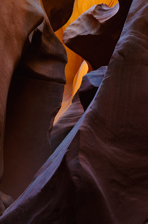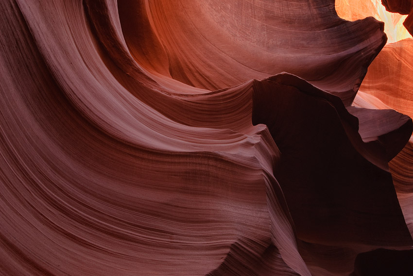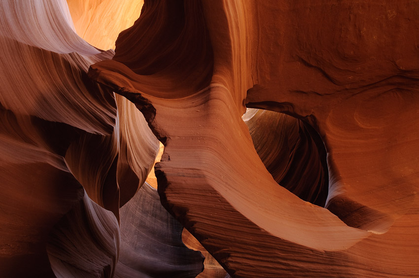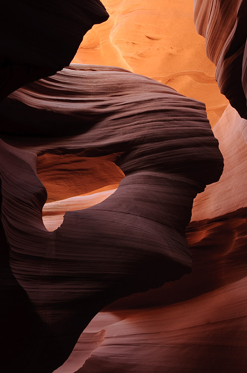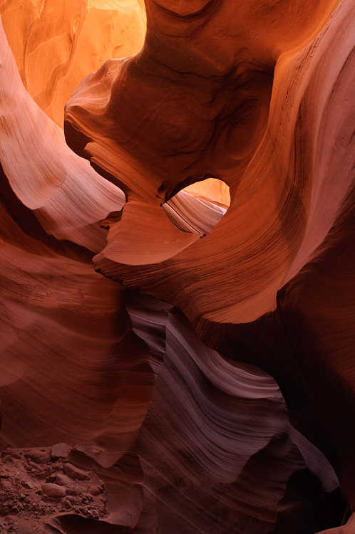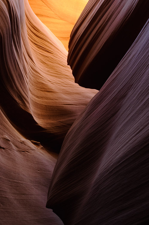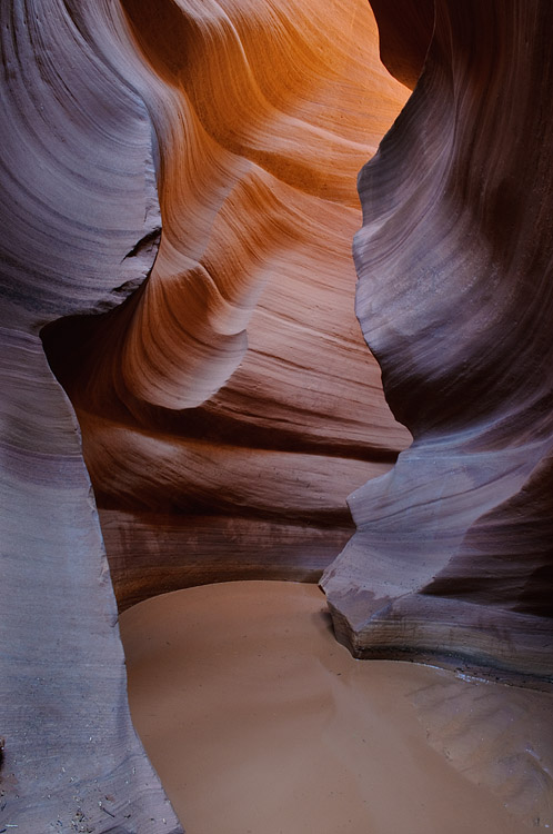 An diesem Morgen haben wir gerade noch Glück. Trotz unserer doppelten Chance werden wir als Letzte gezogen. Uwe ist sehr erleichtert. Wir lernen eine Leipziger Familie kennen, die nicht so viel Glück hat wie wir. Wie immer, klönen wir lange mit ihnen und gehen dann auch gemeinsam in den Lower Antilope Canyon. Wir müssen erst warten, da der Canyon teilweise mit Wasser voll gelaufen ist. Doch nach einiger Zeit dürfen wir rein. Es ist alles etwas rutschig und schlammig, aber die Hälfte des Cayons ist gut begehbar. Trotz der vielen Leute können wir gute Fotos machen. Uwe steigt auch noch in den richtig nassen Teil des Canyons hinab. Dort wird er bis zu den Knien nass, aber das stört ihn nicht weiter. Nachdem ich ca. eine halbe Stunde auf ihn gewartet habe, nehme ich unsere beiden Fotorucksäcke und klettere nach oben. Nach 1 Stunde taucht Uwe dann auf und wir machen uns auf den Weg ins Internetcafé, um unseren Laptop aufzuladen und E-Mails anzugucken. |