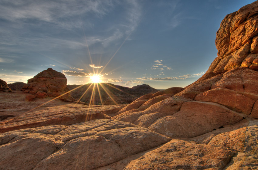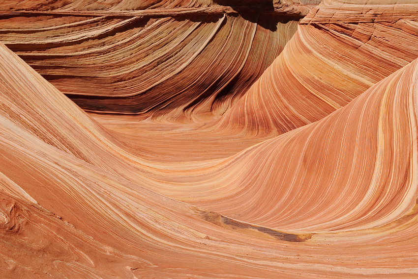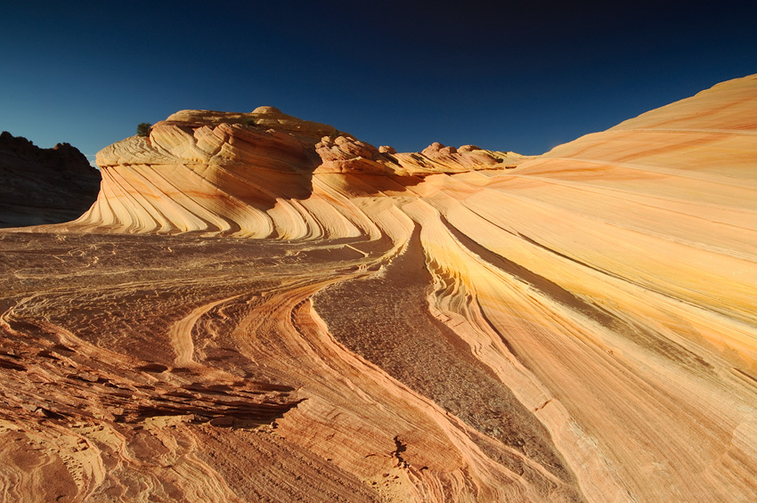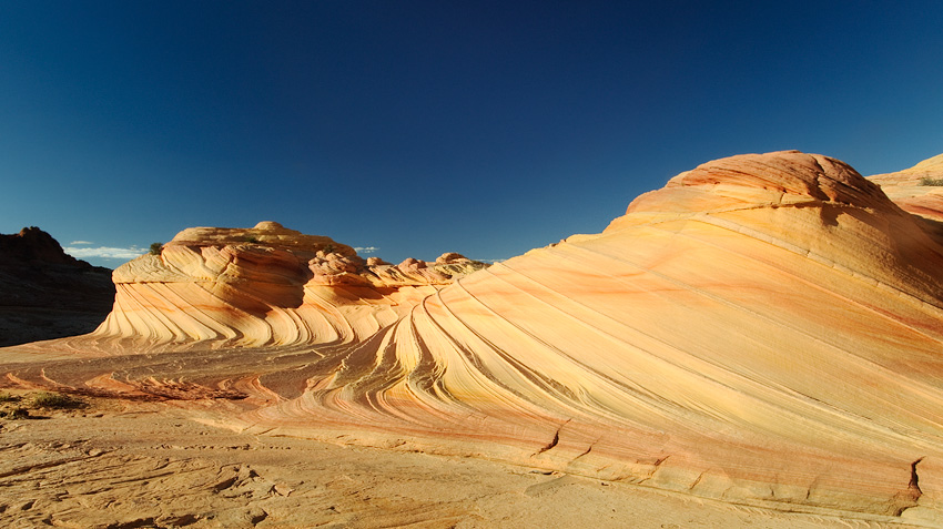 Ich suche mir ein schattiges Plätzchen, wo ich die nächsten 3 Stunden verbringen werde. Uwe ist von einer Unruhe getrieben. Er steigt von der Second Wave ab und findet wunderschöne Strukturen, die ihn begeistern. Nach ca. 3 Stunden kommt er wieder hoch und wir machen gemeinsam Fotos von der Second Wave, die im Abendlicht einfach grandios aussieht. Die Sonne verschwindet schon so gegen 19.00 Uhr hinter dem Berg, so dass wir noch im Hellen den Rückweg antreten und beenden können.