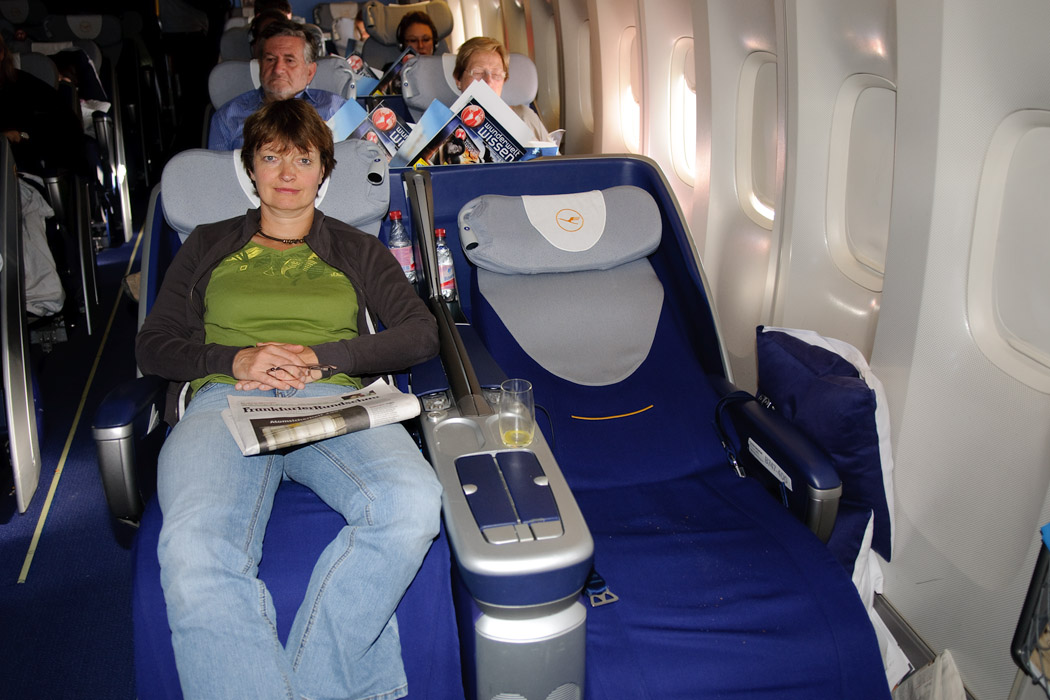 Der Lufthansaflug ist gnadenlos überbucht. Man macht uns ein verlockendes Angebot. Wenn wir bereit wären, einen Tag später zu fliegen, würde Lufthansa uns die Übernachtung im Hotel, die Verpflegung für den Tag und pro Person 600€ auf die Hand zahlen. Da sind wir schon ernsthaft ins Grübeln geraten. Für 1200€ netto, muss man schon einige Zeit schuften. Wir gehen unsere Buchungen durch und entscheiden uns dagegen. Stattdessen versucht Uwe, da wir noch keine Sitzplätze reserviert, jedoch sehr frühzeitig gebucht hatten, Plätze in der Buisinesclass zu bekommen. Sein Charme wirkt und wir werden hochgestuft. Zwar können wir dann nicht nebeneinander sitzen, aber für einen bequemen Sitz in der Nacht nehmen wir das in Kauf. Während wir anstehen, um einzusteigen, kommt Uwe mit einem viel reisenden Herrn ins Gespräch. Zufällig wäre er mein Nachbar geworden. Als er mitbekommt, dass das so ist, bietet er sofort an, mit Uwe zu tauschen. So haben wir eine ziemlich ruhige Nacht und müssen nicht einmal das Schnarchen fremder Nachbarn ertragen.