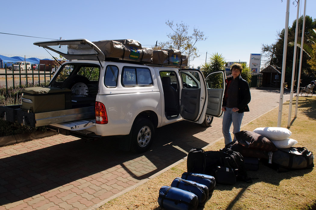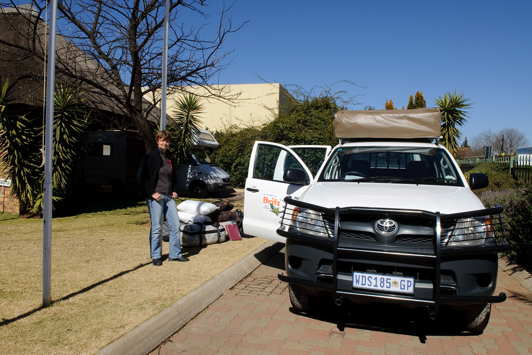 Gegen 9.00 Uhr morgens erreichen wir Johannesburg. Unser Gepäck haben wir eine Stunde später und der Herr von der Autovermietung Britz steht auch gleich bereit, um uns zu fahren. Die Autoübernahme dauert dann allerdings fast 3 Stunden. Ein Dachzelt muss abgebaut werden, ein Tresor eingebaut, viele Dinge zum Reifenwechseln müssen noch zusammen gesucht werden und so weiter und so weiter…..
