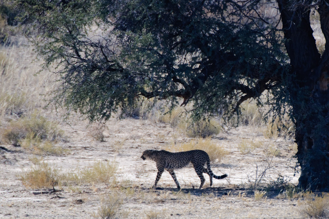 Am Fluss angekommen, werden wir von anderen auf eine Gepardin aufmerksam gemacht, die mindestens 300m weit weg unter einem Baum liegt. Sie gibt helle Klagelaute von sich. Manchmal erhebt sie sich, streckt sich und legt sich wieder hin. Nach einer Weile geht sie den Fluss entlang und wir können ihren eleganten Gang bewundern. Leider kommt sie uns nicht näher. Wir staunen darüber, wie schnell sie vorwärts kommt, sichtlich ohne sich anzustrengen. Irgendwann verschwindet sie im Dickicht und wir können sie nicht mehr sehen.