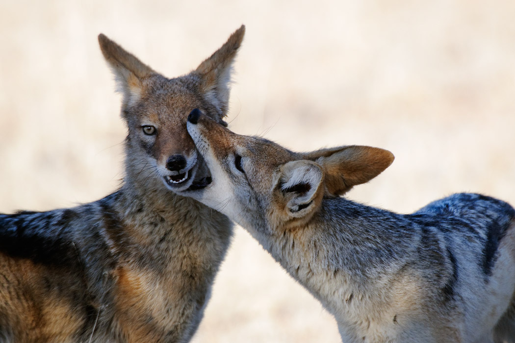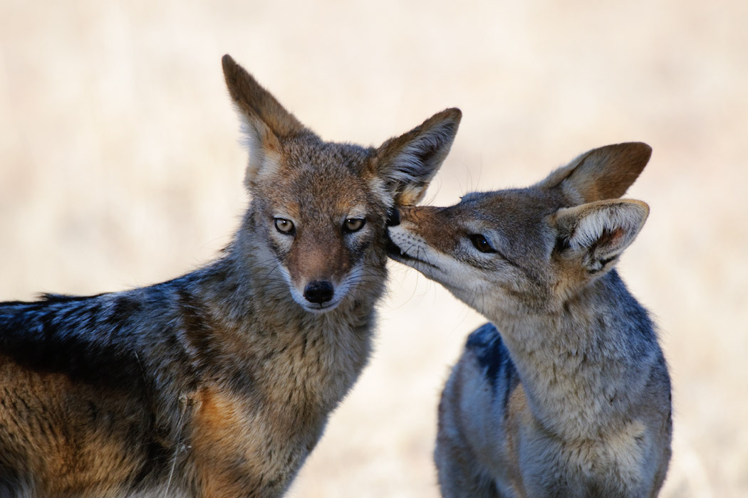 An diesem Morgen sehen wir einige Oryxe, die auf dem Rand einer roten Düne im Gegenlicht stehen. Mit dem großen Objektiv gibt das schöne Bilder. Später spielen drei junge Schakale direkt auf der Wiese neben der Straße. Das sieht lustig aus und ist auch sehr fotogen. So haben wir wenigstens schöne Fotos, auch wenn uns die großen Tiere nicht begegnen.