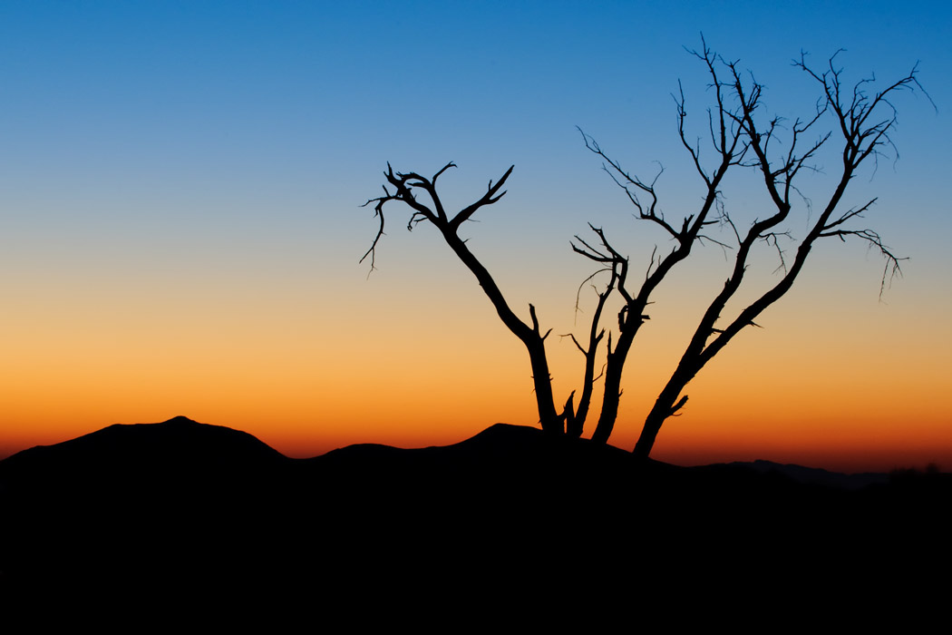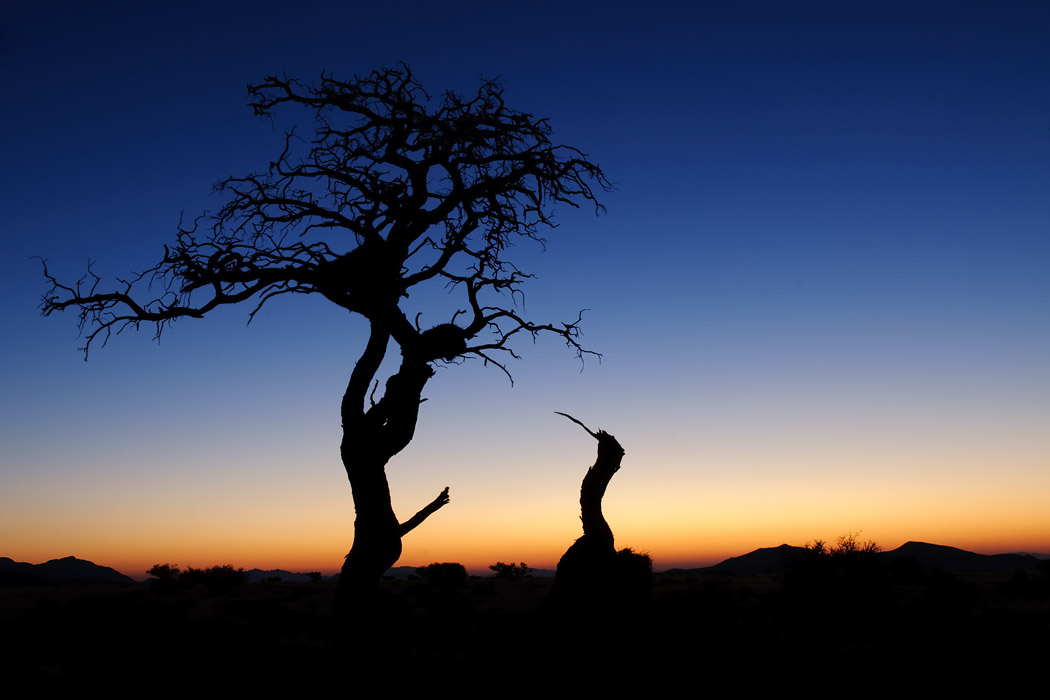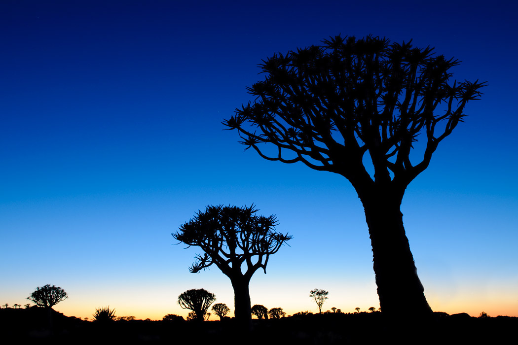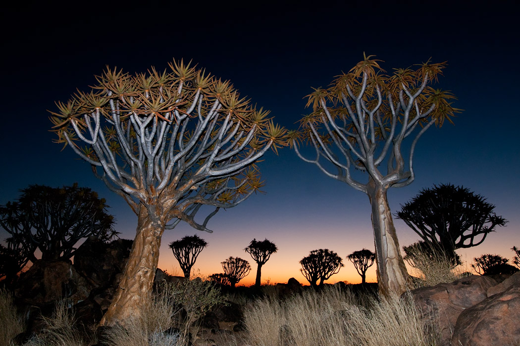 Im Anschluss gehen wir in den Köcherbaumwald. Hier sind noch viele andere Touristen. Dennoch gelingen uns ein paar schöne Bilder, insbesondere nach dem Sonnenuntergang gibt es ein besonderes Licht. Während ich eingewickelt in zwei Jacken mit Hilfe meiner Stirnlampe lese, macht Uwe wunderschöne Aufnahmen, bei denen er die Bäume anblitzt und gleichzeitig das Abendrot einfängt.