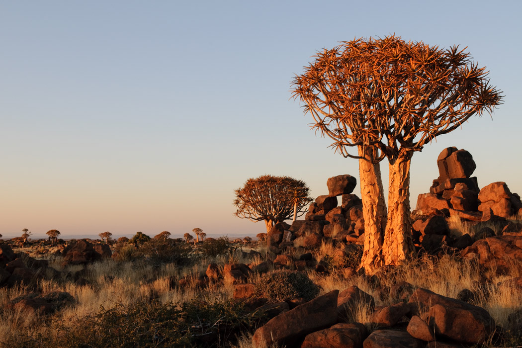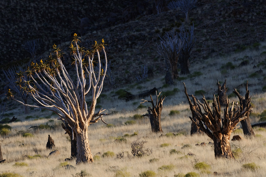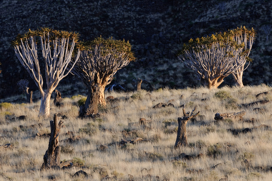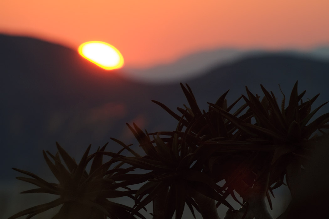 Wie immer wachen wir kurz vor Sonnenaufgang auf und fahren raus auf die Farm. Auch hier gibt es einen Köcherbaumwald, der jedoch eine völlig andere Struktur hat als der in Keetmanshoop.