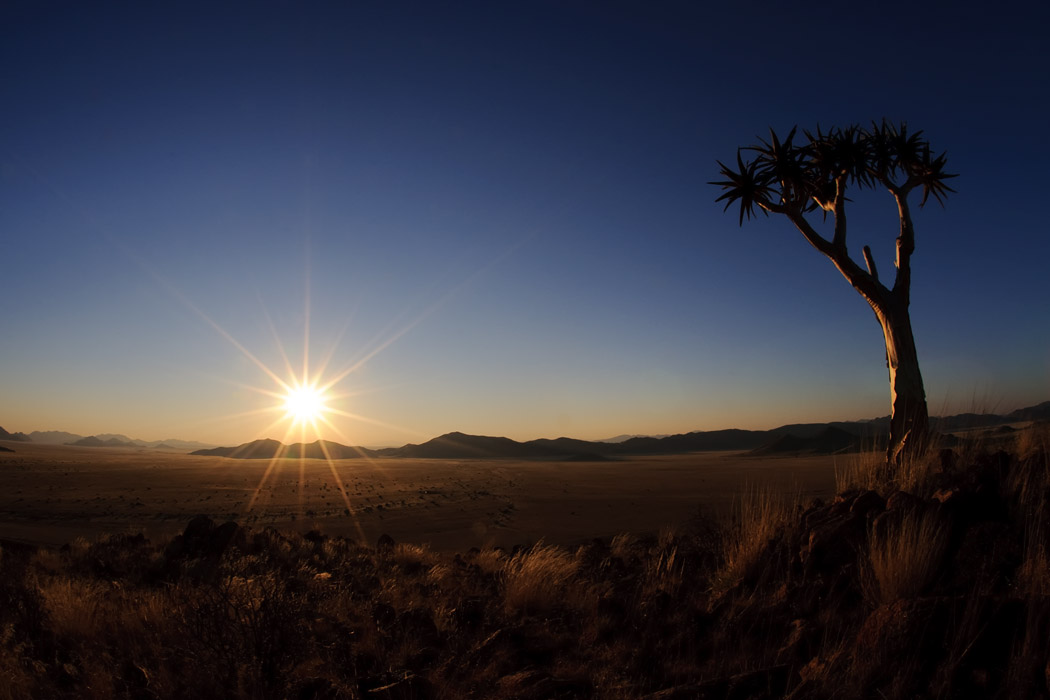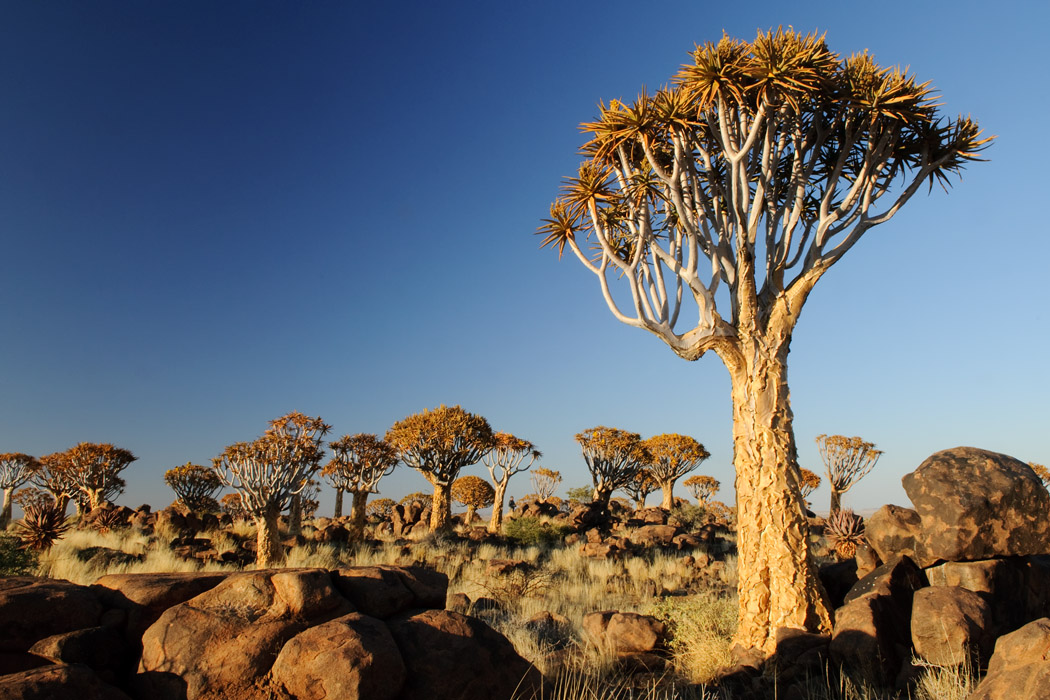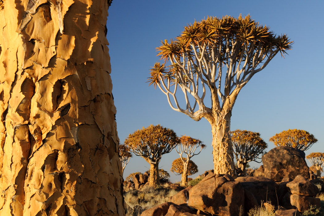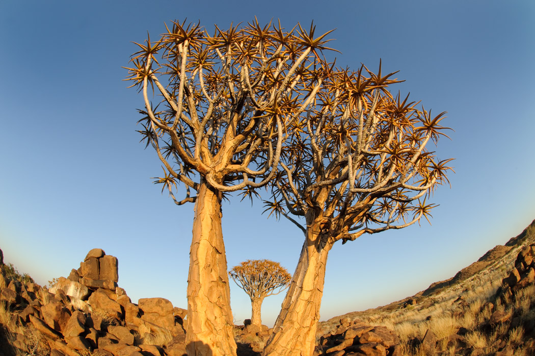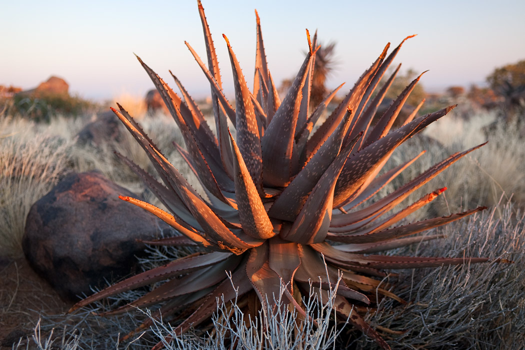 Wie immer wachen wir kurz vor Sonnenaufgang auf und fahren raus auf die Farm. Auch hier gibt es einen Köcherbaumwald, der jedoch eine völlig andere Struktur hat als der in Keetmanshoop.