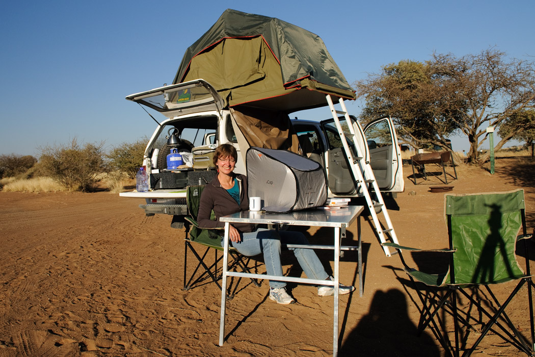 Als wir auf den Zeltplatz zurückkommen, trinken unsere südafrikanischen Nachbarn mit einem anderen Ehepaar gerade ein Bier. Sie fragen uns, wie uns der Flug gefallen hat. Die Frau, eine Rechtsanwältin für Arbeitsrecht, ist sehr temperamentvoll und witzig. Sie ist neugierig und gibt immer freche Antworten. Ihr Mann und sie stehen gerade am Beginn einer 9 monatigen Tour durch Afrika. Vielleicht treffen wir sie ja Weihnachten in Äthiopien.