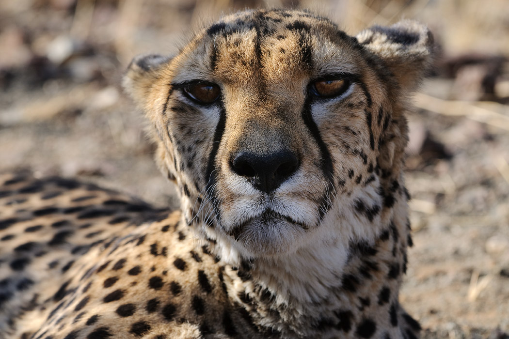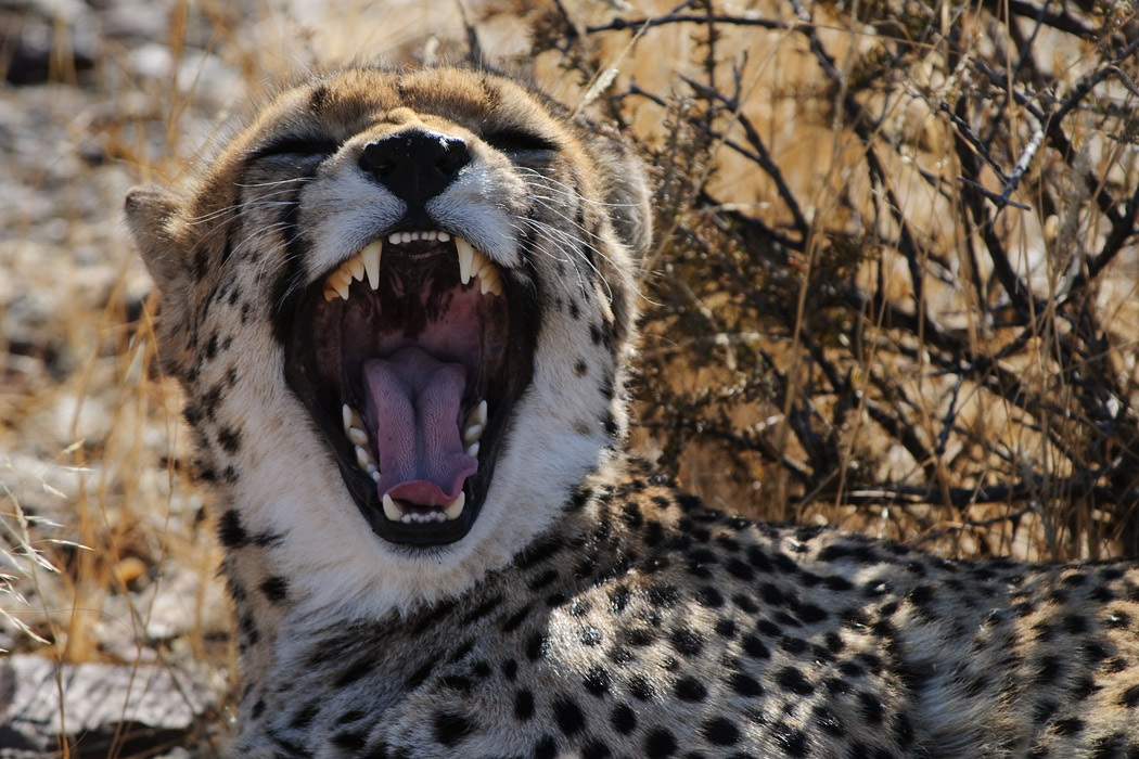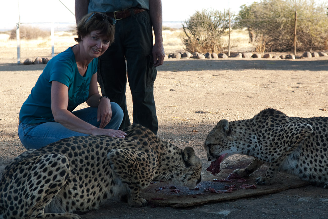 Der Zeltplatz ist recht frei und wir erkennen ihn auch gut wieder. Vor 3 Jahren hat unsere Namibiareise hier so richtig begonnen. Pünktlich um 16.00 Uhr erscheinen wir zur Fütterung der Geparden. Leider haben wir noch die südafrikanische Zeit. Es ist in Namibia erst 15.00 Uhr. Mehr aus Spaß fragen wir, ob man die Geparden auch ohne Zaun fotografieren kann. Man kann! Wir dürfen ohne weitere Sicherheitsregeln in ein Gehege, in dem 2 Chitas leben. Mit einem leichten Grummeln im Bauch nutzen wir diese Chance. Schon nach 3 Minuten taucht das erste Tier neben uns auf. Es guckt wendet sich ab und geht weiter spazieren. Ein Foto gelingt, dann ist es schon wieder weg. Wir finden es wieder, aber das Licht ist nicht so ideal, außerdem geht das Tier immer wieder weg. Wir suchen auch das zweite Tier, aber das scheint schon in der Nähe der Küche auf die baldige Fütterung zu warten.