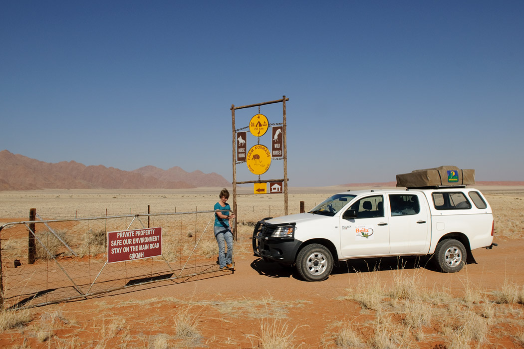 In einer knappen Stunde schaffen wir den Weg zum Tor. 60 km/h kann man dazu natürlich nicht fahren. Aber wir sind nicht allein. Außer uns müssen sich noch etliche andere Besucher beeilen. Diese Geldeinnahmequelle haben die Namibier zum Glück noch nicht angezapft.