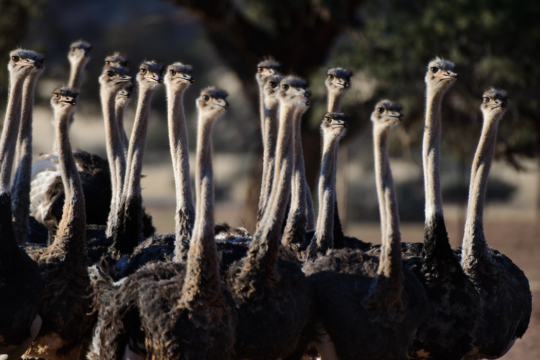 Anschließend fahren wir mit seinem 26 Jahre alten Auto über die Farm. Uwe möchte gern 40 Straußenhälse fotografieren. Es gibt eine Herde junger Vögel, die vor uns wegläuft. Roland treibt die Tiere vorsichtig so, dass Uwe sie knipsen kann. Die Tiere bewegen sich wie ein Schwarm Fische. Das ist spannend zu beobachten.