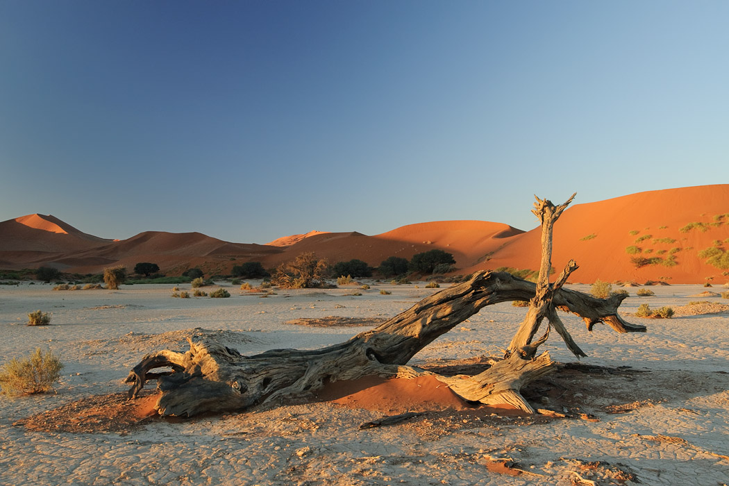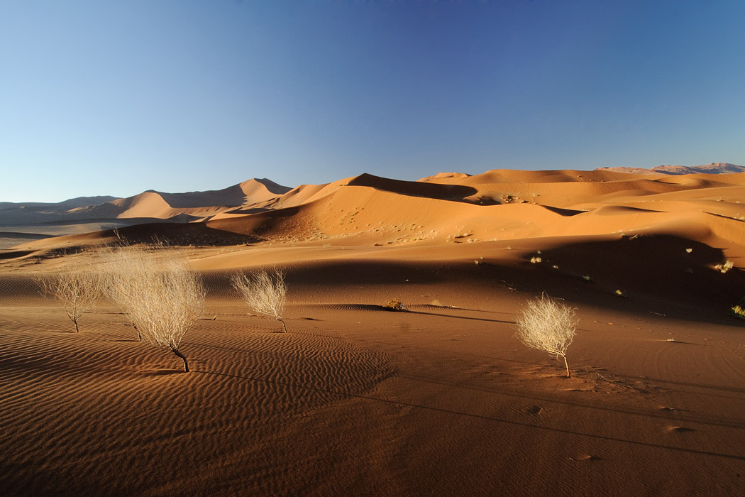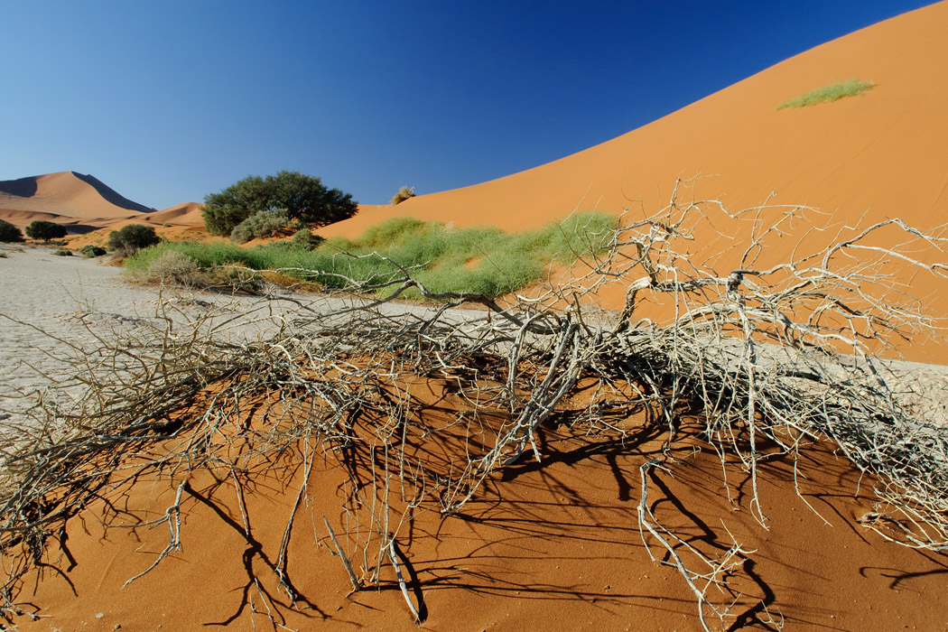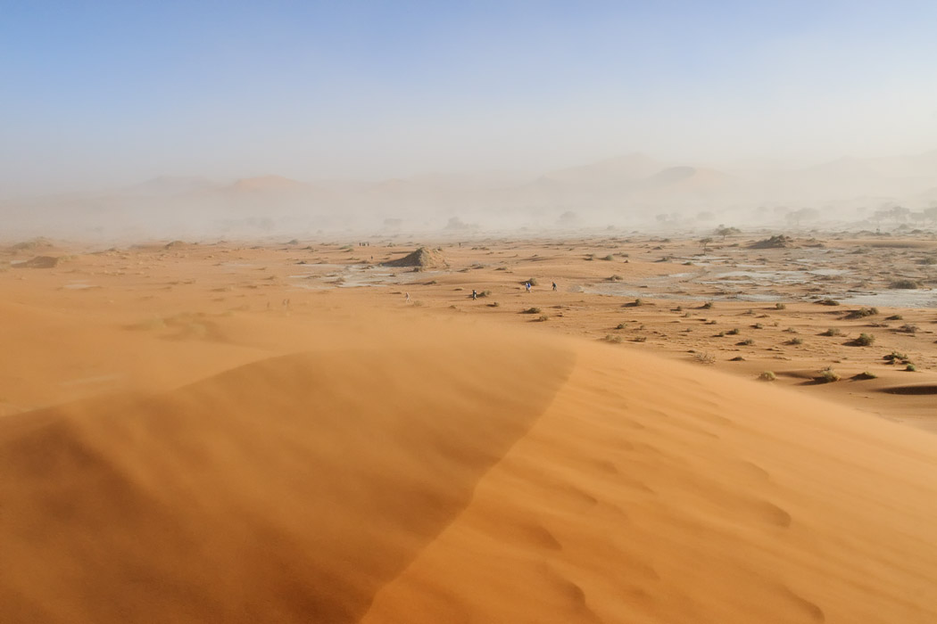 Es sind sehr viele Menschen auf dem Weg zum Dead Vlei. Dort kommt der Wind tatsächlich aus der entgegengesetzten Richtung und bläst das Vlei frei von Sand.